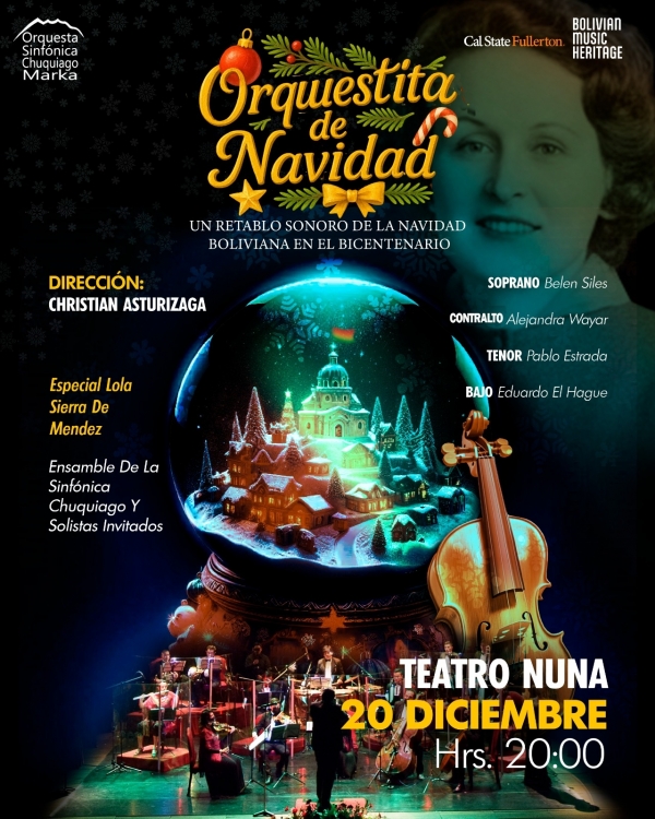 Orquestita de Navidad, a cargo del ensamble de la Sinfónica Chuquiago, presenta un emotivo homenaje a la obra de Lola Sierra de Méndez, ofreciendo al público un viaje sonoro que revive la esencia de nuestras celebraciones, costumbres y los villancicos más populares que acompañan la tradición de los festejos navideños en Bolivia.