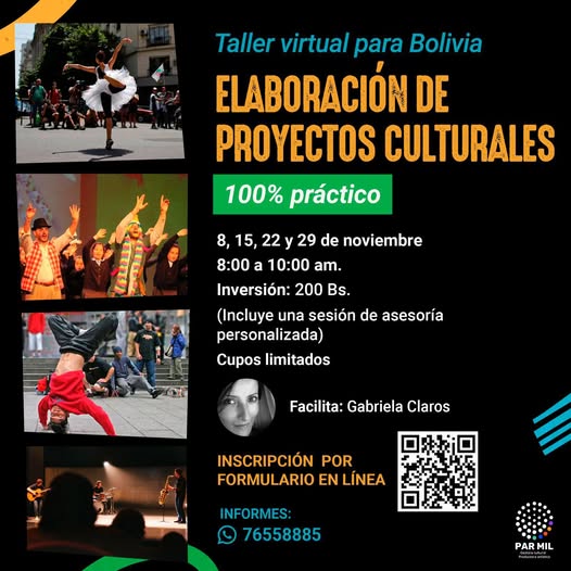 El taller propone un espacio de aprendizaje teórico y práctico sobre la elaboración de proyectos culturales. A lo largo de cuatro sesiones virtuales intensivas, se abordarán técnicas y estrategias para desarrollar propuestas creativas. Facilitadora: Gabriela Claros.