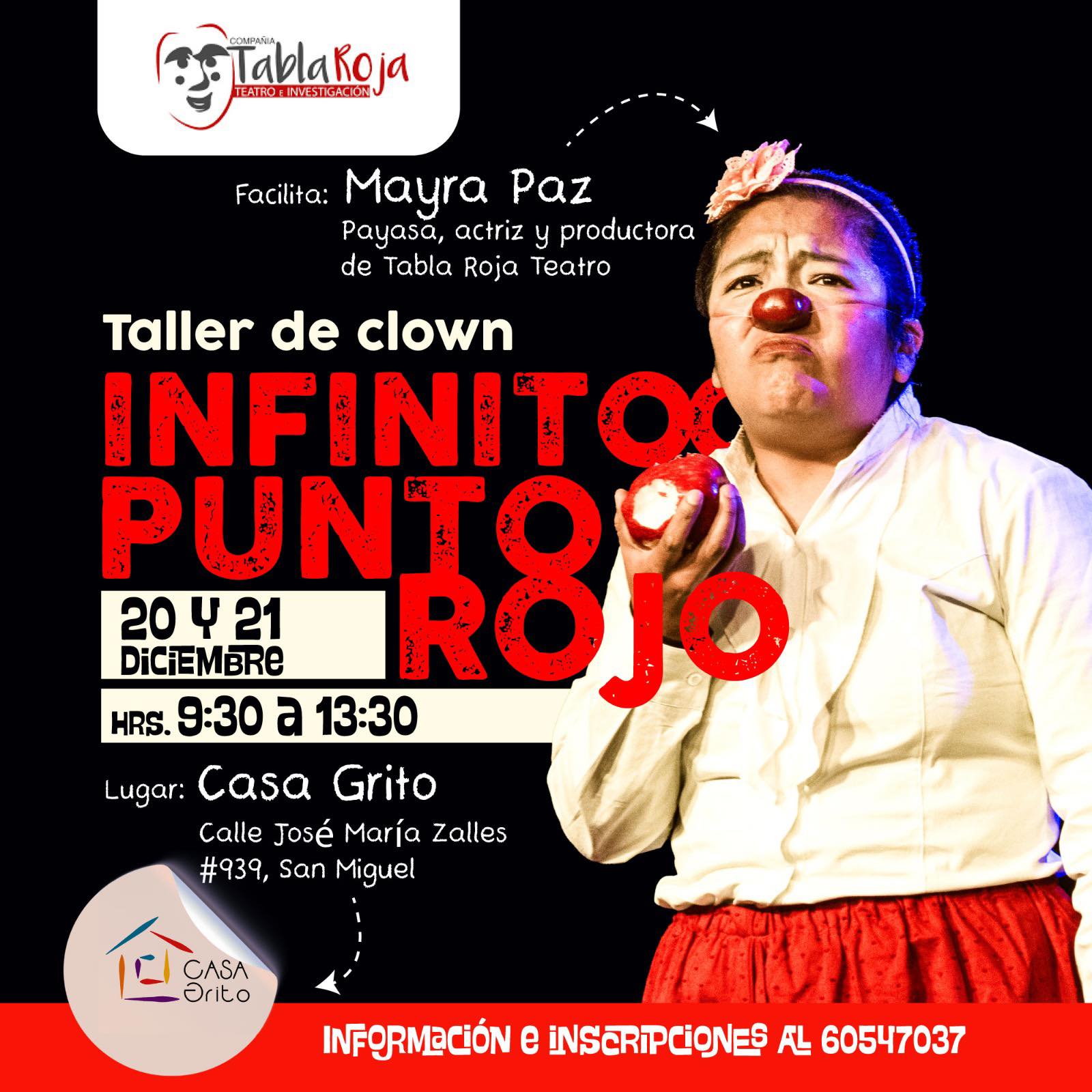Este taller introductorio propone un acercamiento al clown a través del teatro físico, la improvisación y la exploración del cuerpo como herramienta expresiva. Se trabajará la presencia, la escucha y el placer del fracaso como impulso creativo. El taller será facilitado por Mayra Paz, payasa, actriz y productora de Tabla Roja Teatro.