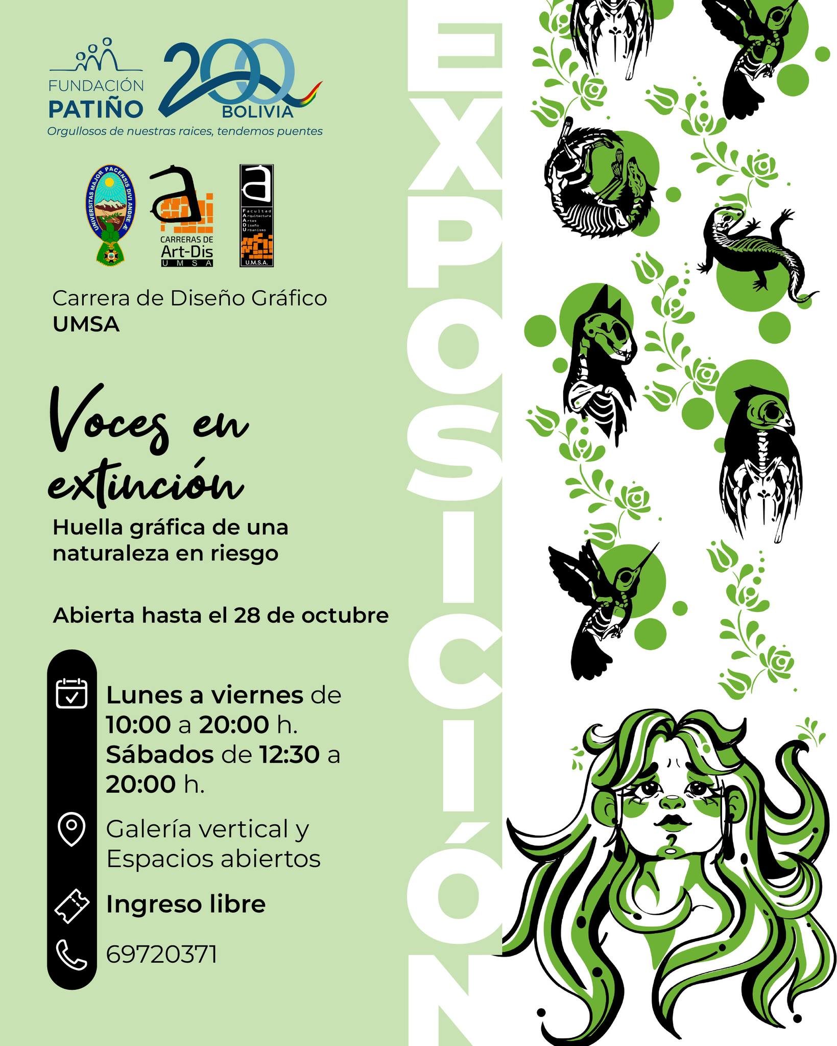 La exposición “Voces en extinción. Huella gráfica de una naturaleza en riesgo” presenta el trabajo de estudiantes de la Carrera de Diseño Gráfico de la UMSA, quienes, a través de la técnica de la serigrafía sobre tela y papel, abordan la fragilidad de los ecosistemas y la necesidad urgente de reconectar con la Madre Tierra. … Leer más