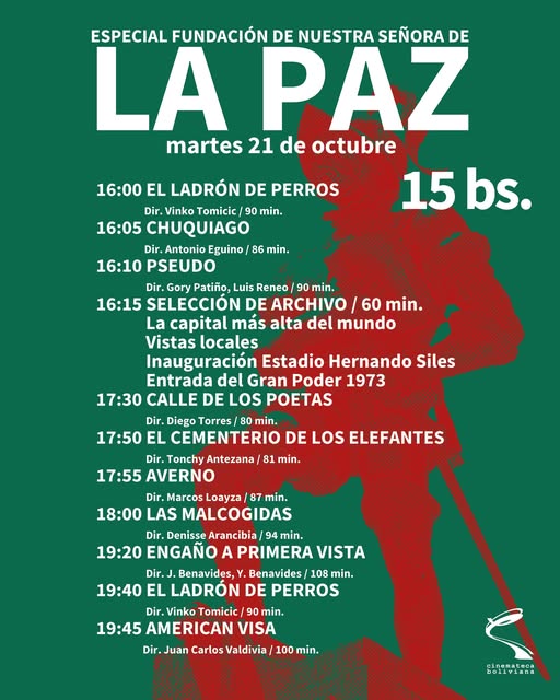 Este 20 de octubre se cumplen 477 años de la Fundación de Nuestra Señora de La Paz, y en la Cinemateca Boliviana se celebrará el martes 21, con un especial de películas bolivianas que tienen a la urbe paceña como coprotagonista.