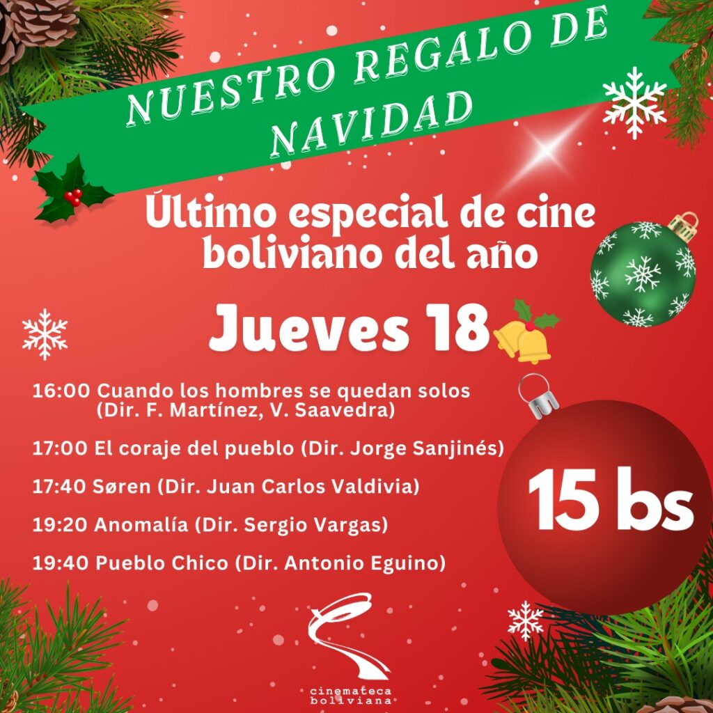 Como cierre del año, la Cinemateca Boliviana presenta un especial de cine boliviano, una selección curada de producciones nacionales que celebran la identidad, la memoria y las miradas diversas de nuestro cine.Esta propuesta navideña invita al público a reencontrarse con historias locales en la pantalla grande, reafirmando el compromiso de la Cinemateca con la difusión y valoración del audiovisual boliviano.