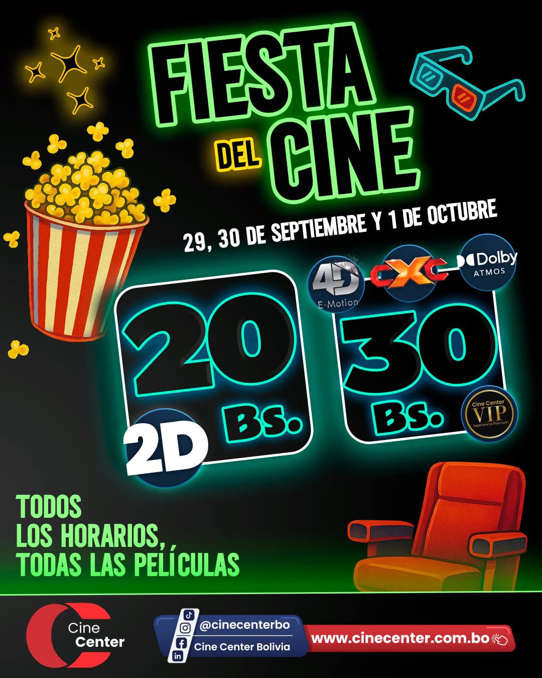 Válido en todas sus sucursales, para todas las funciones y en todas las películas. Preventa disponible desde el sábado 27 de septiembre a las 10:00 a.m. en la web cinecenter.com.bo, app Cine Center Bolivia y boleterías.