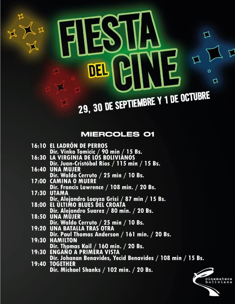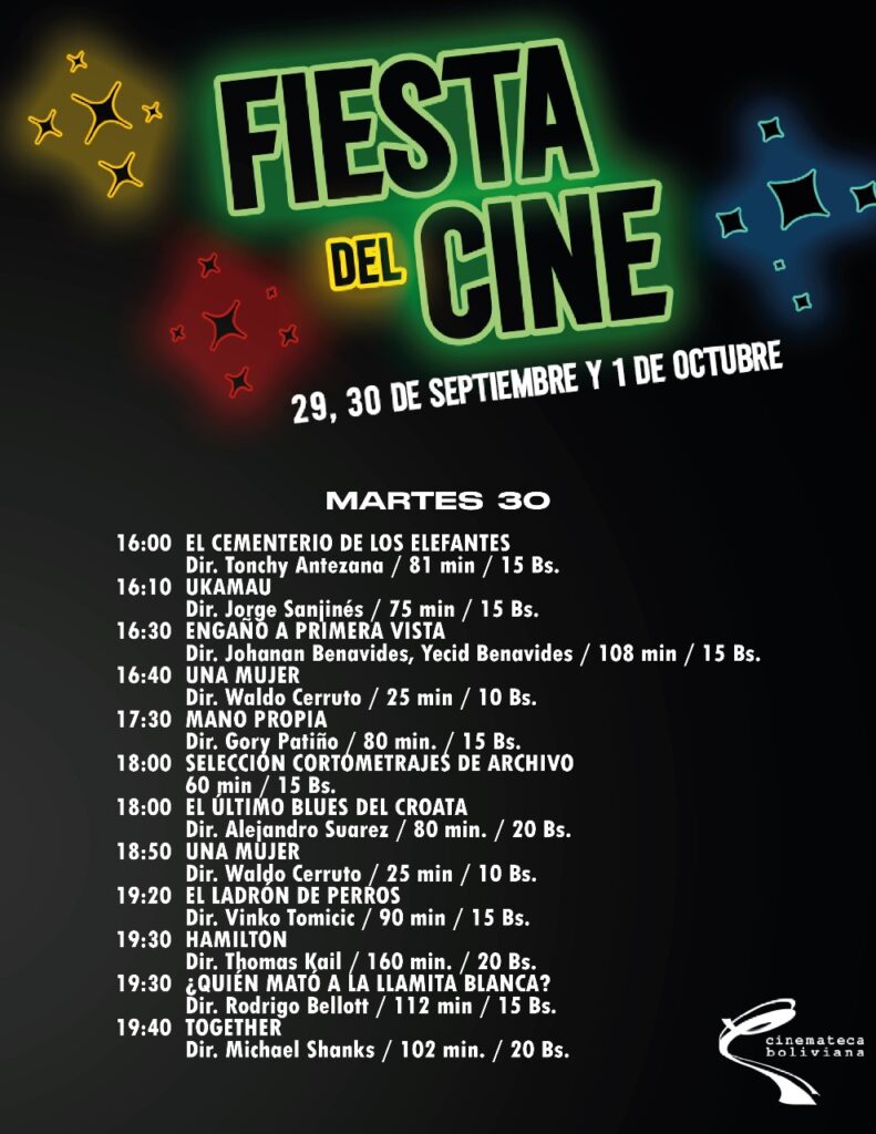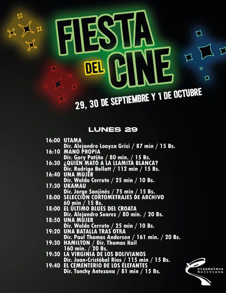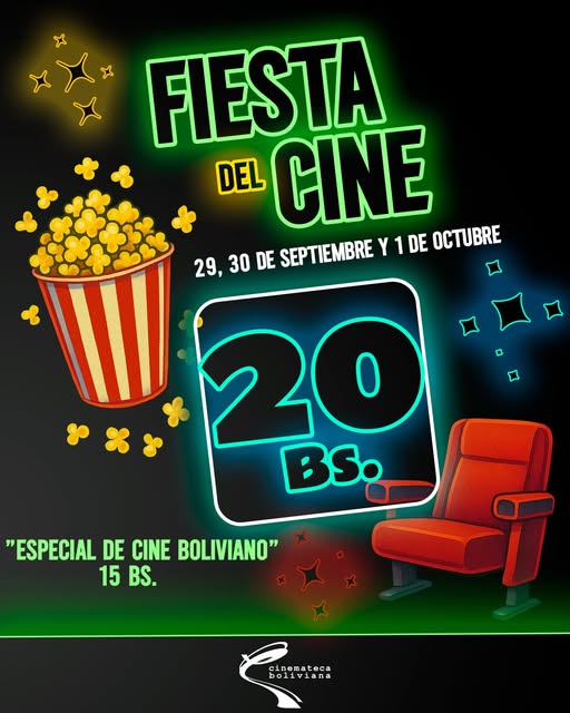La fiesta del cine llega a la Cinemateca Boliviana. Una celebración con películas internacionales tan solo Bs 20, junto a cine boliviano a tan solo Bs 15. Esta la cartelera: