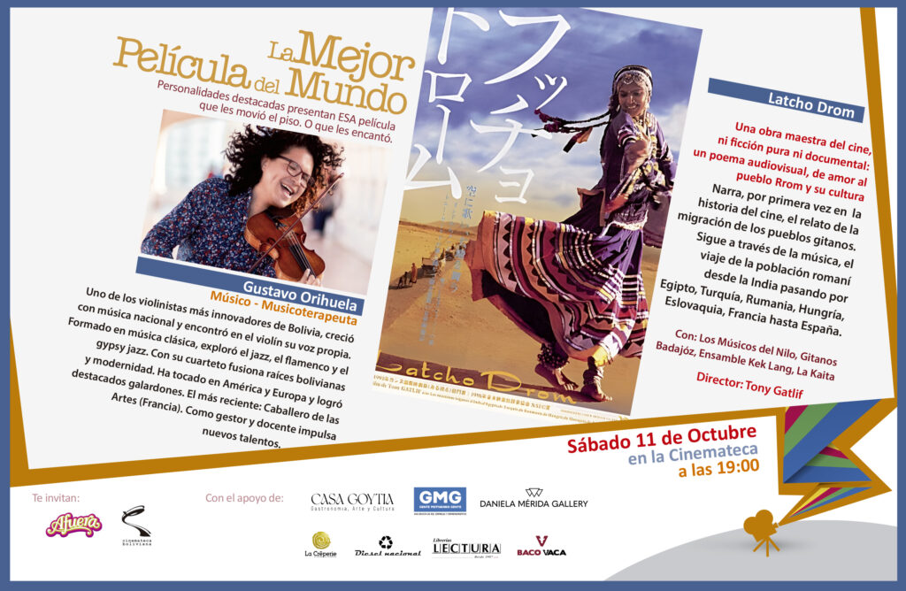 Esta actividad, que se realiza en la Cinemateca Boliviana, anuncia la presentación del querido y talentoso músico Gustavo Orihuela, como invitado de honor del mes de octubre. El sábado 11 estará presentando esa película que le encanta y quiere compartir: «Latcho Drom» de Tony Gatlif.