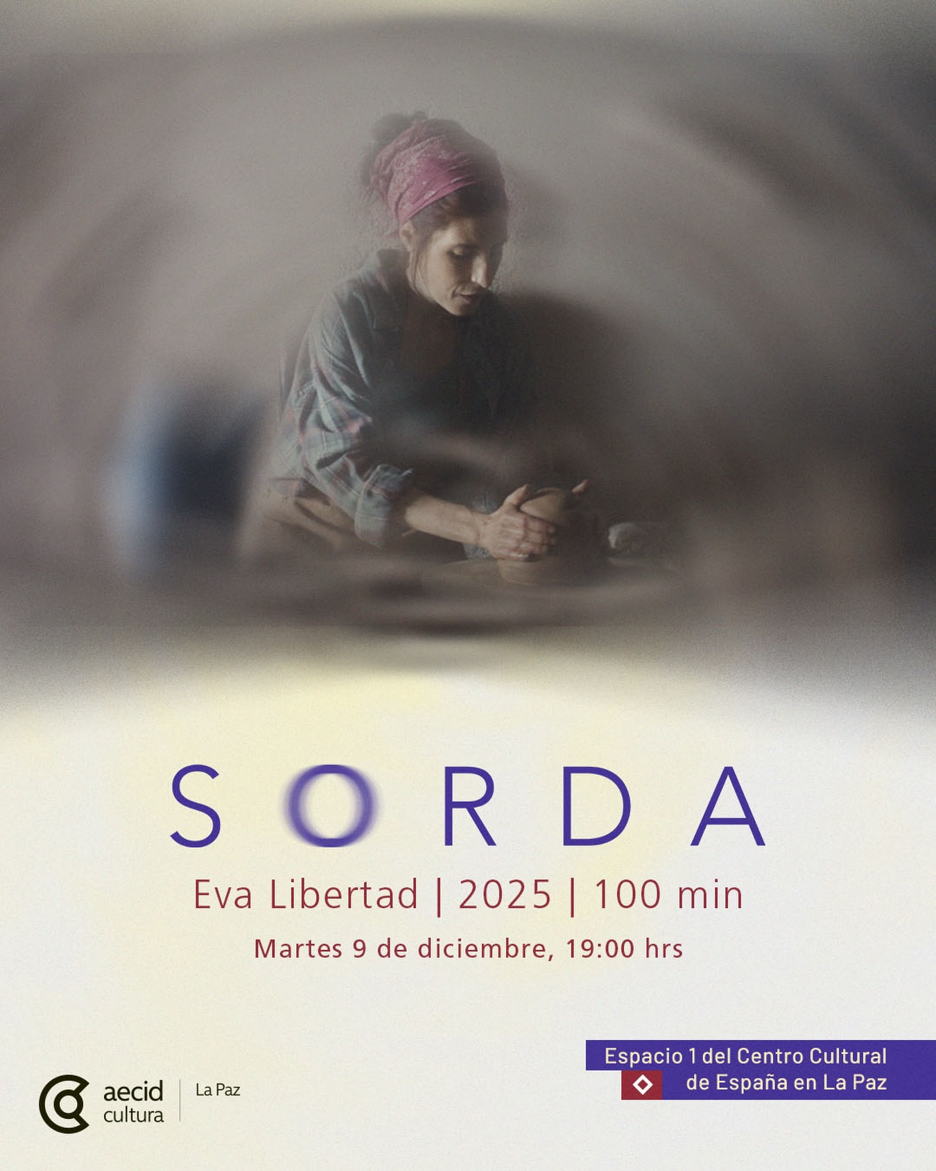 El afiche presenta una imagen en tonos suaves y difuminados de una mujer joven que trabaja una pieza de cerámica con las manos. Lleva un pañuelo fucsia que recoge su cabello y una camisa amplia de cuadros. El desenfoque que rodea la escena genera un ambiente íntimo y cálido que concentra la atención en su gesto. En la franja inferior, sobre un fondo claro, se destaca el título “Sorda” en letras grandes de color violeta, seguido de la información técnica esencial y los datos de la función.
