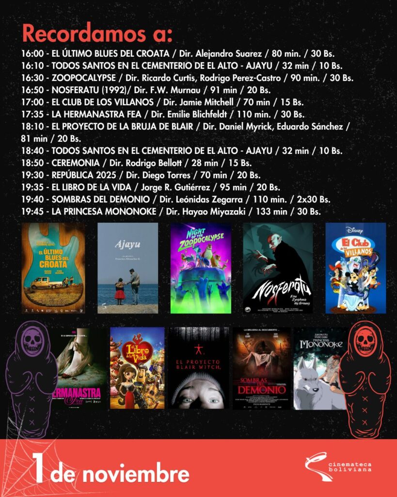La Cinemateca Boliviana presenta una jornada especial con motivo de Todos Santos, que combina cine de terror y producciones nacionales. La programación incluye películas para diferentes públicos y precios accesibles, en una maratón que celebra la tradición y el género fantástico.