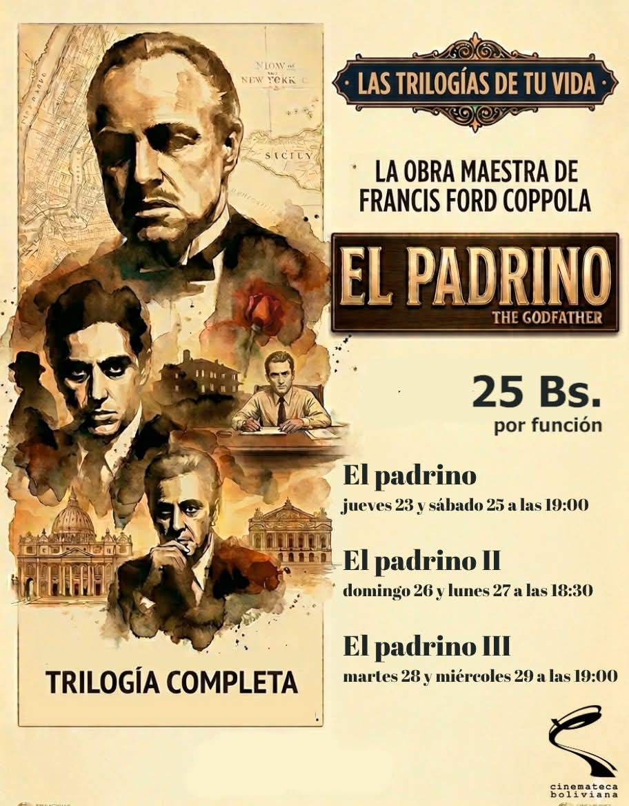 Inauguración de un nuevo ciclo dedicado a las trilogías más influyentes del cine, comenzando con la icónica saga de Francis Ford Coppola «El Padrino». A lo largo de varias fechas, el público podrá revivir una de las historias más emblemáticas del séptimo arte, explorando el poder, la familia y la transformación a través de una narrativa que marcó generaciones.
