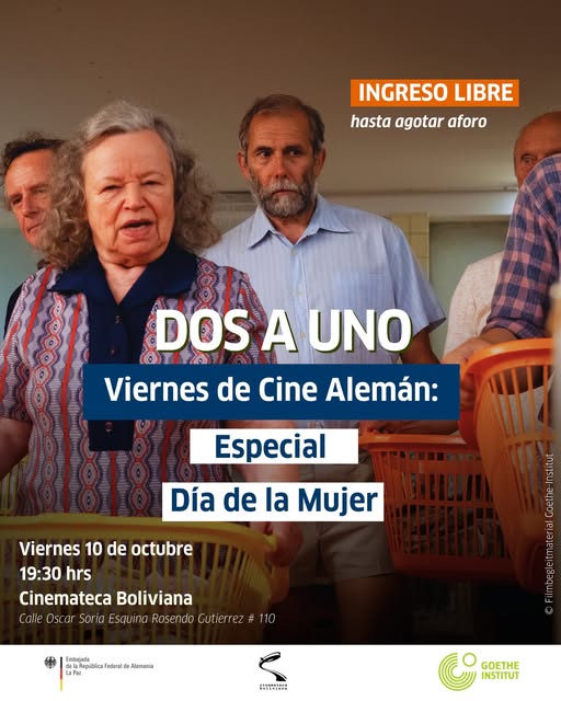 El Goethe-Institut La Paz y la Embajada de Alemania te invitan a una noche cultural especial en la Cinemateca Boliviana para conmemorar el Día de la Mujer Boliviana. Comenzará con la proyección de la película alemana Zwei zu eins, una comedia inteligente y conmovedora sobre tres mujeres que, en medio de la precariedad, descubren su fuerza y solidaridad.