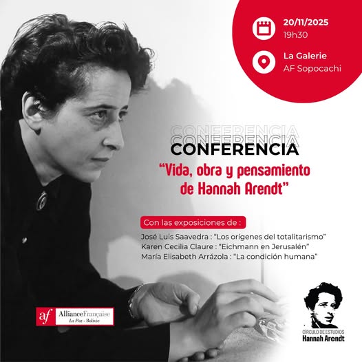 En el marco del Día Mundial de la Filosofía y a 50 años del fallecimiento de Hannah Arendt, la Alianza Francesa invita a esta conferencia, que ha sido propuesta por el Círculo de Estudios de Hannah Arendt. Un espacio dedicado a redescubrir el legado de una de las pensadoras más influyentes del siglo XX y reflexionar sobre su mirada crítica del poder, la libertad y la condición humana, temas que están más vigentes que nunca.