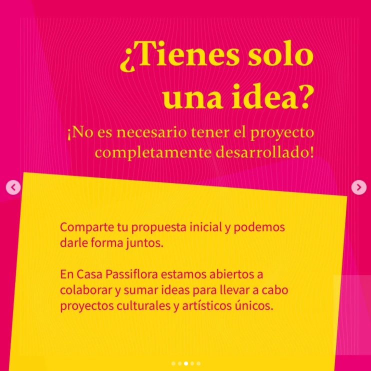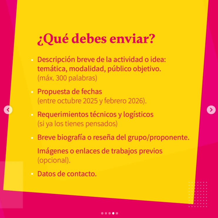 Se ofrecen espacios equipados para desarrollar tu proyecto, difusión en redes sociales y apoyo logístico, oportunidad para realizar talleres, espacios para exposiciones.
