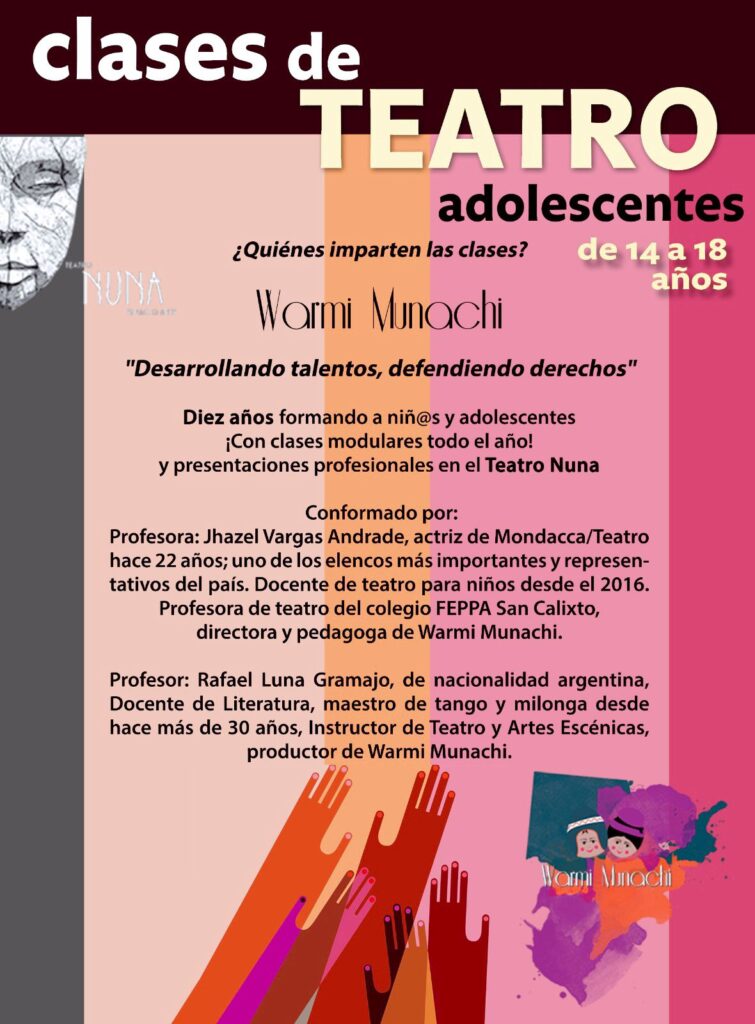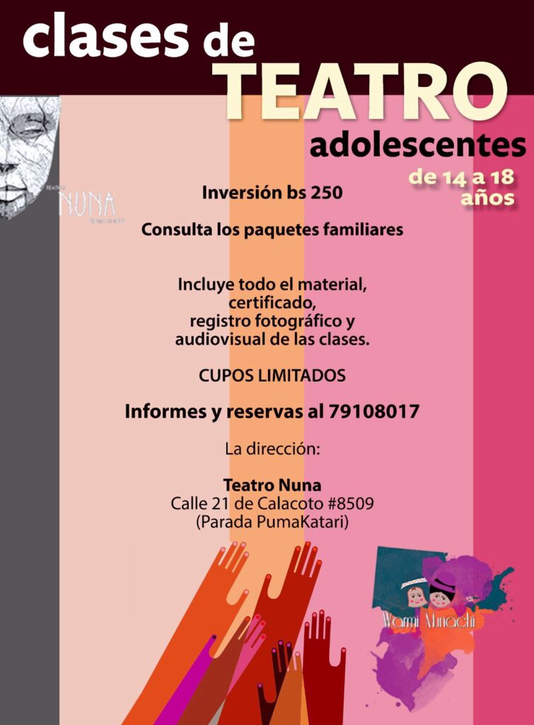 DETALLES DEL EVENTO A flor de piel: clases con Mondacca Teatro El grupo Mondacca Teatro abre clases de teatro para adolescentes de 14 a 18 años, del 8 al 27 de enero en el Teatro Nuna. MÁS INFORMACIÓN 79108017 ETIQUETAS teatro INFORMACIÓN DEL EVENTO Mondacca Teatro Teatro Nuna https://www.facebook.com/profile.php?id=100052680982384 COSTO 250 Bs FECHA 08/01/2026 − 27/01/2026 HORA 17:00 − 18:30 UBICACIÓN Calle 21 de Calacoto #8509 (Parada Puma Katari), Guarda este evento en tu calendario. GOOGLE CALENDAR MÁS INFORMACIÓN 79108017 ETIQUETAS teatro Comparte este evento con tus contactos
