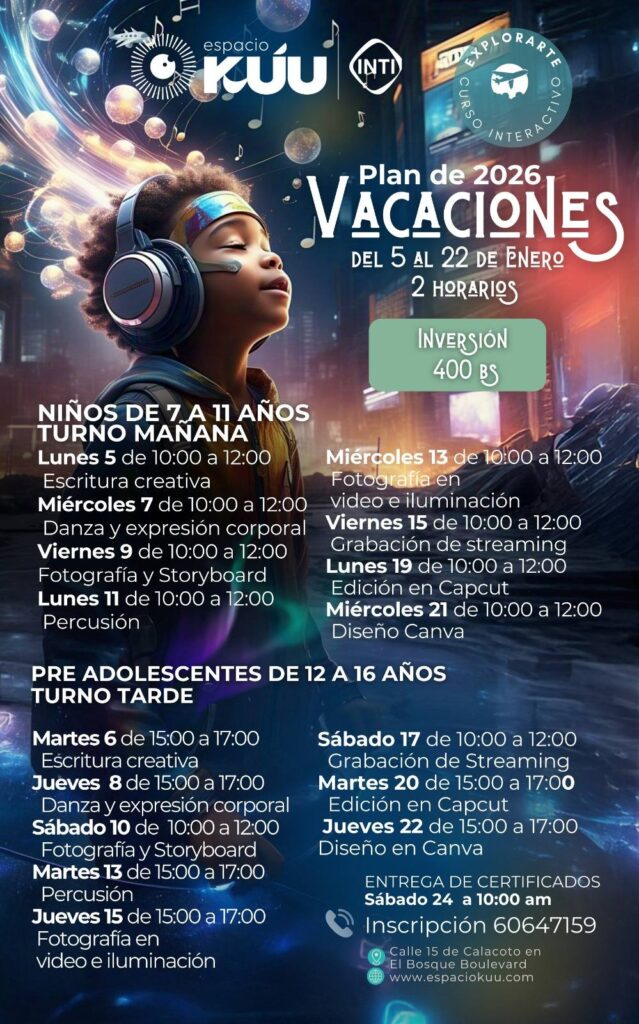 DETALLES DEL EVENTO Explorarte en Kúu Inti: cursos vacacionales Explorarte en su segunda versión, del 5 al 22 de enero, espacio donde se creará, aprendiendo y soñando en El Bosque Boulevard. En su primera versión más de 50 niños fueron parte del curso interactivo Explorarte, en junio. MÁS INFORMACIÓN 60647159 ETIQUETAS creatividad, cursos vacacionales INFORMACIÓN DEL EVENTO Espacio Kúu Inti https://www.facebook.com/espaciokuuinti https://www.instagram.com/espaciokuuinti/ COSTO Bs 400 FECHA 05/01/2026 − 22/01/2026 HORA 10:00 − 12:00 UBICACIÓN Calle 15, Calacoto El Bosque Boulevard Guarda este evento en tu calendario. GOOGLE CALENDAR MÁS INFORMACIÓN 60647159 ETIQUETAS creatividad, cursos vacacionales Comparte este evento con tus contactos