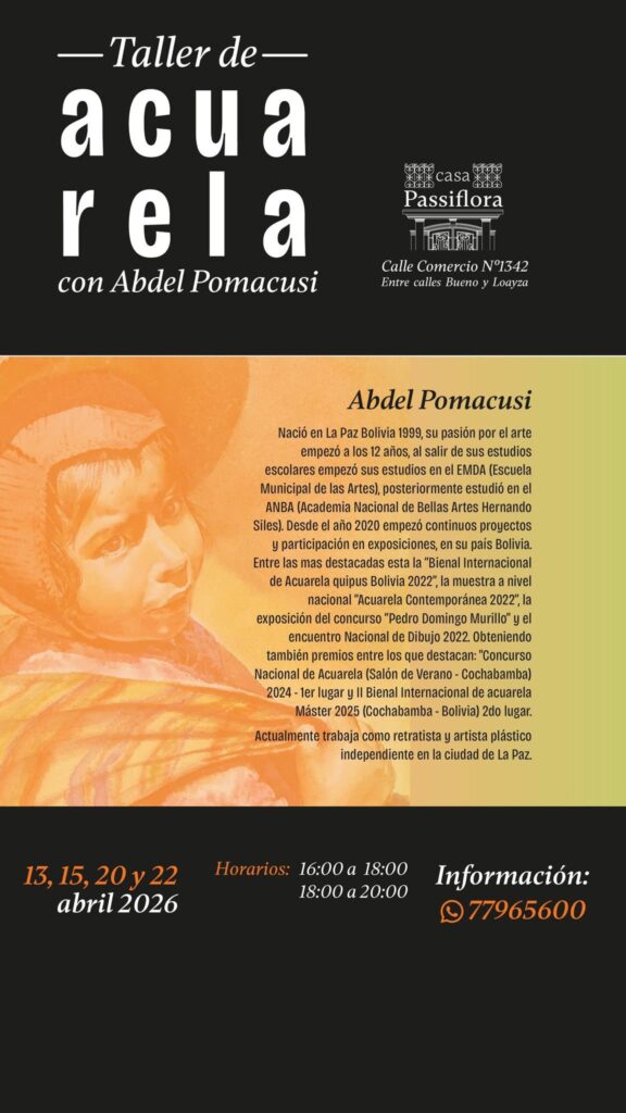 Un espacio creativo para iniciarse o fortalecer habilidades en acuarela, explorando paisajes a través de la luz, el color y la atmósfera. El taller será guiado por el artista paceño Abdel Pomacusi, quien compartirá técnicas y acompañará el proceso paso a paso en un ambiente práctico y accesible para todos los niveles.