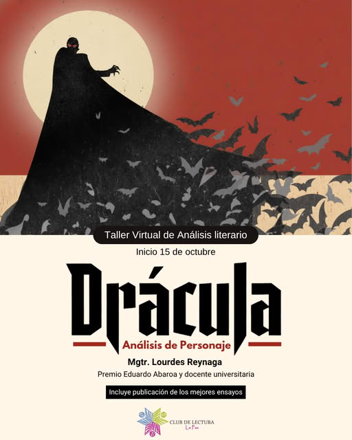 El Club de Lectura La Paz invita a participar del taller virtual de análisis literario sobre Drácula, una experiencia formativa que propone explorar en profundidad uno de los personajes más fascinantes de la literatura universal. Bajo la guía de Lourdes Reynaga, destacada escritora y docente universitaria, los participantes estudiarán la construcción de personajes, el uso del diario como recurso narrativo y las múltiples lecturas que ofrece la obra de Bram Stoker.