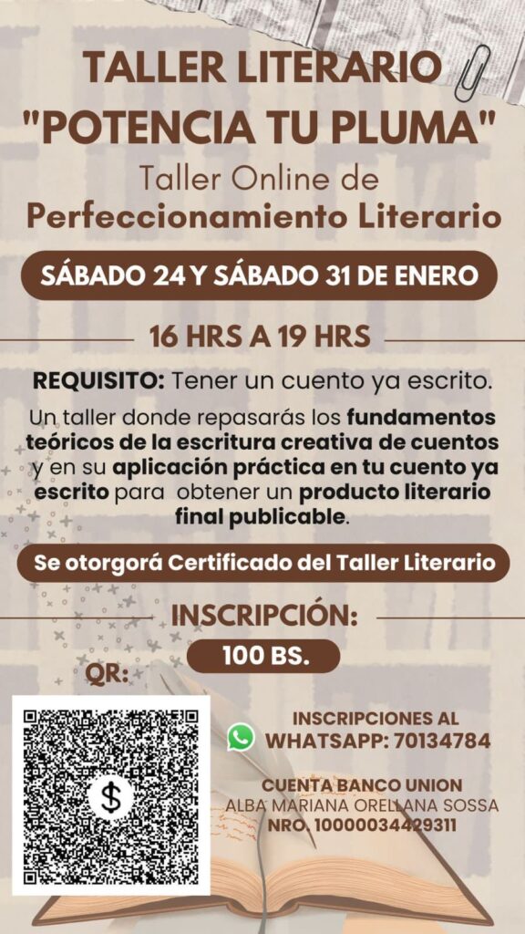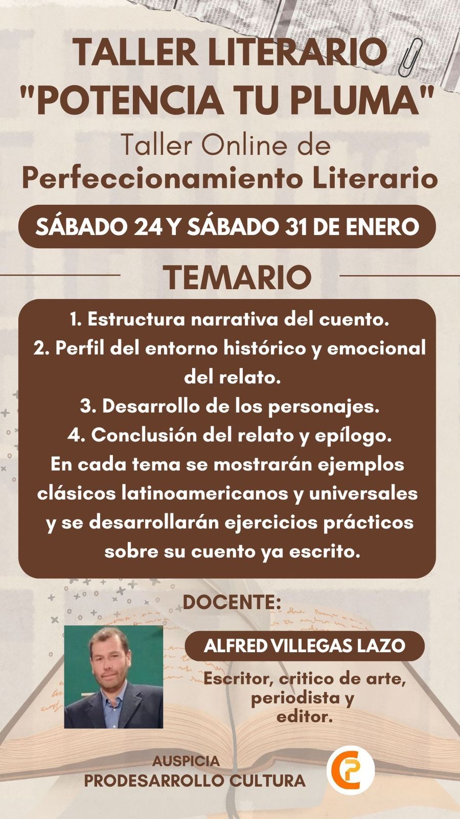 El escritor, editor, periodista y crítico de arte, Alfred Villegas, propone este taller de perfeccionamiento literario titulado Potencia tu pluma. Serán dos sesiones en las que repasarán fundamentos teóricos y prácticos para la elaboración de cuentos.