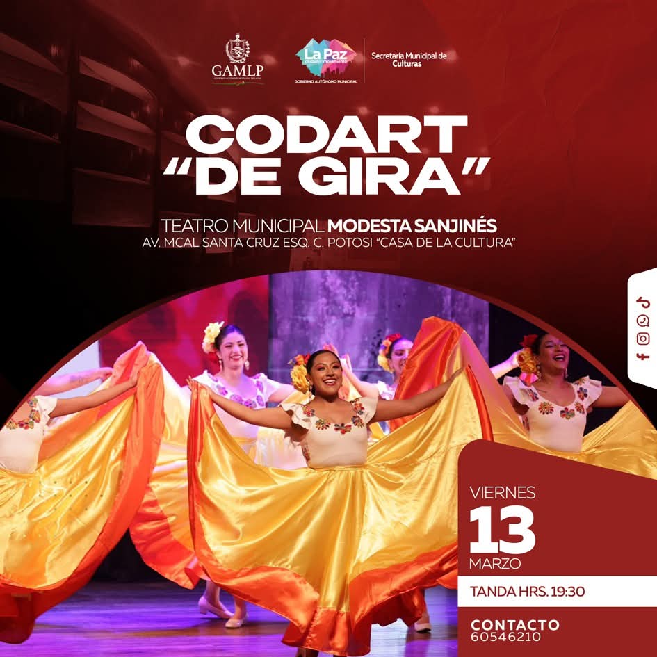 Un espectáculo de danza folklórica que celebra la identidad y la diversidad cultural de Bolivia a través del movimiento, la música y el color. CODART “De Gira” propone un recorrido escénico por distintas tradiciones del país, donde cada coreografía evoca el espíritu de los pueblos y la riqueza de sus expresiones culturales. Una invitación a vivir en escena el ritmo, la energía y la herencia de las danzas bolivianas.
