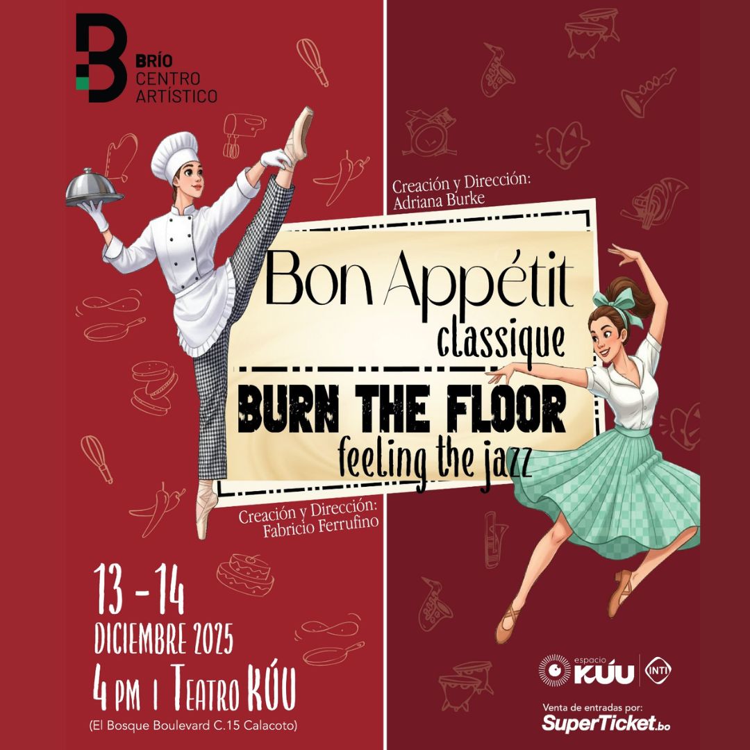 El Centro Artístico Brío presenta dos producciones en una misma función: Bon Appétit Classique y Burn the Floor. La primera es una propuesta escénica que combina danza y comedia en torno al universo culinario, con música francesa y dirección de Adriana Burke. La segunda, dirigida por Fabricio Ferrufino, rinde homenaje al jazz y sus orígenes a través de coreografías llenas de ritmo y energía. Ambas piezas se presentan como cierre de gestión 2025 en el Teatro Kúu Inti.