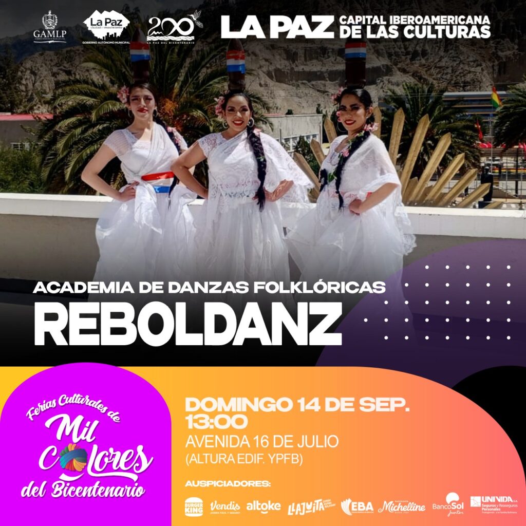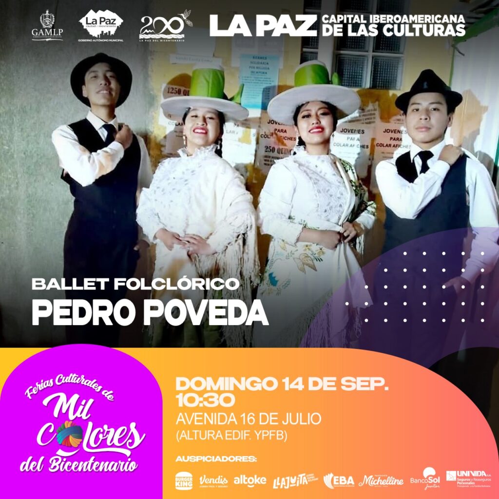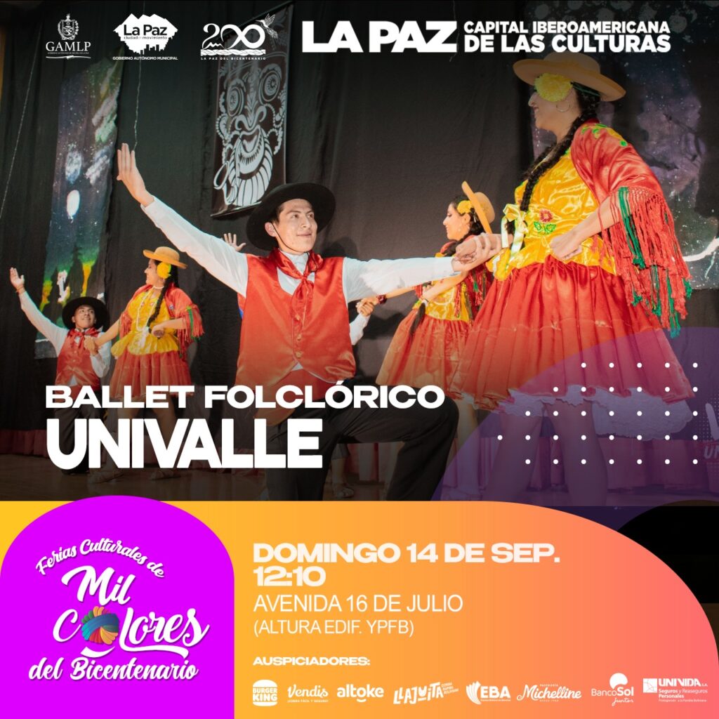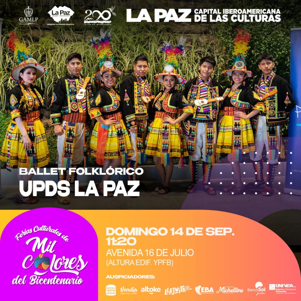 La tradicional Feria dominical de mil colores regresa con una jornada llena de danza, música y actividades culturales para toda la familia. En esta ocasión el escenario de danza contará con la participación del Ballet Folklórico Pedro Poveda, el Ballet Folklórico UPDS La Paz, el Ballet Folklórico Univalle y la Academia de Danzas Folklóricas Reboldanz. Además de los espectáculos en vivo, la feria ofrece espacios de libros, artesanía y propuestas artísticas que convierten a La Paz en un punto de encuentro cultural cada fin de semana.