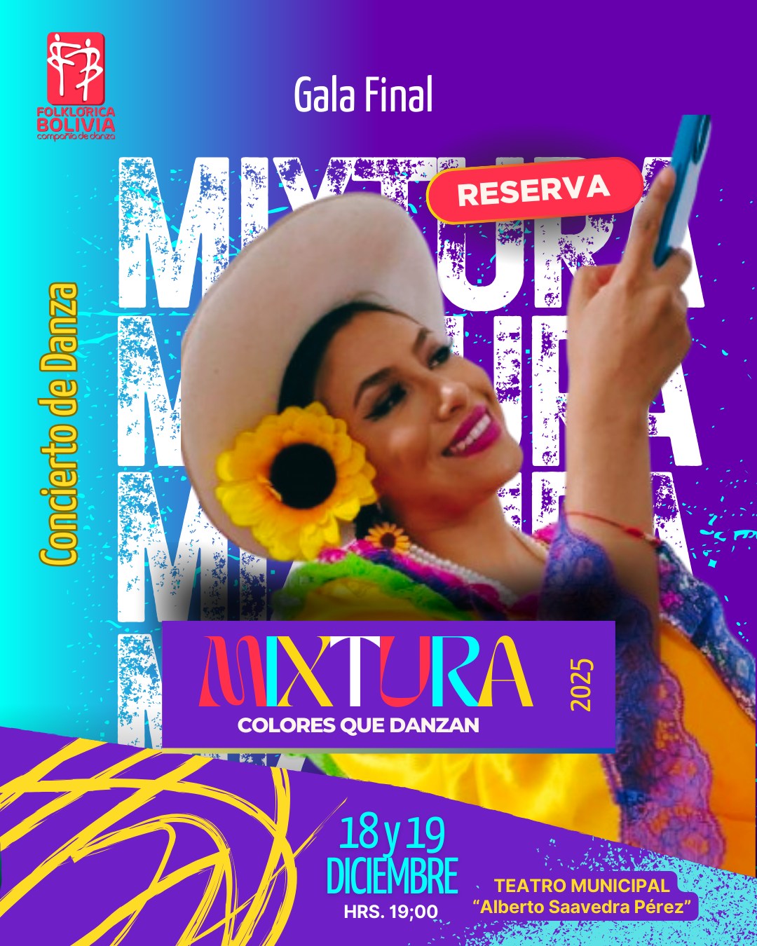 Folklórica Bolivia – Compañía de Danza presenta Mixtura, su gala de cierre de gestión 2025. Un espectáculo que reúne vestuario, música y movimiento en una propuesta que celebra la identidad cultural a través de la danza folklórica. La función invita al público a disfrutar una noche dedicada a los colores, ritmos y expresiones que conforman el patrimonio dancístico del país.