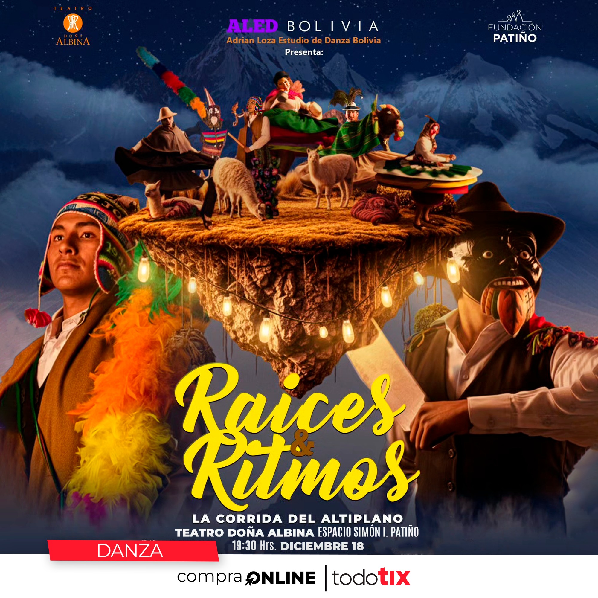ALED Bolivia presenta la segunda edición de La Corrida del Altiplano «Raíces & Ritmos», una obra que recupera los ritmos tradicionales del Waca Waca —Tinti y Pinquillo— y a personajes que forman parte de la memoria cultural andina, como el kusillo, la lechera y el torero andino.