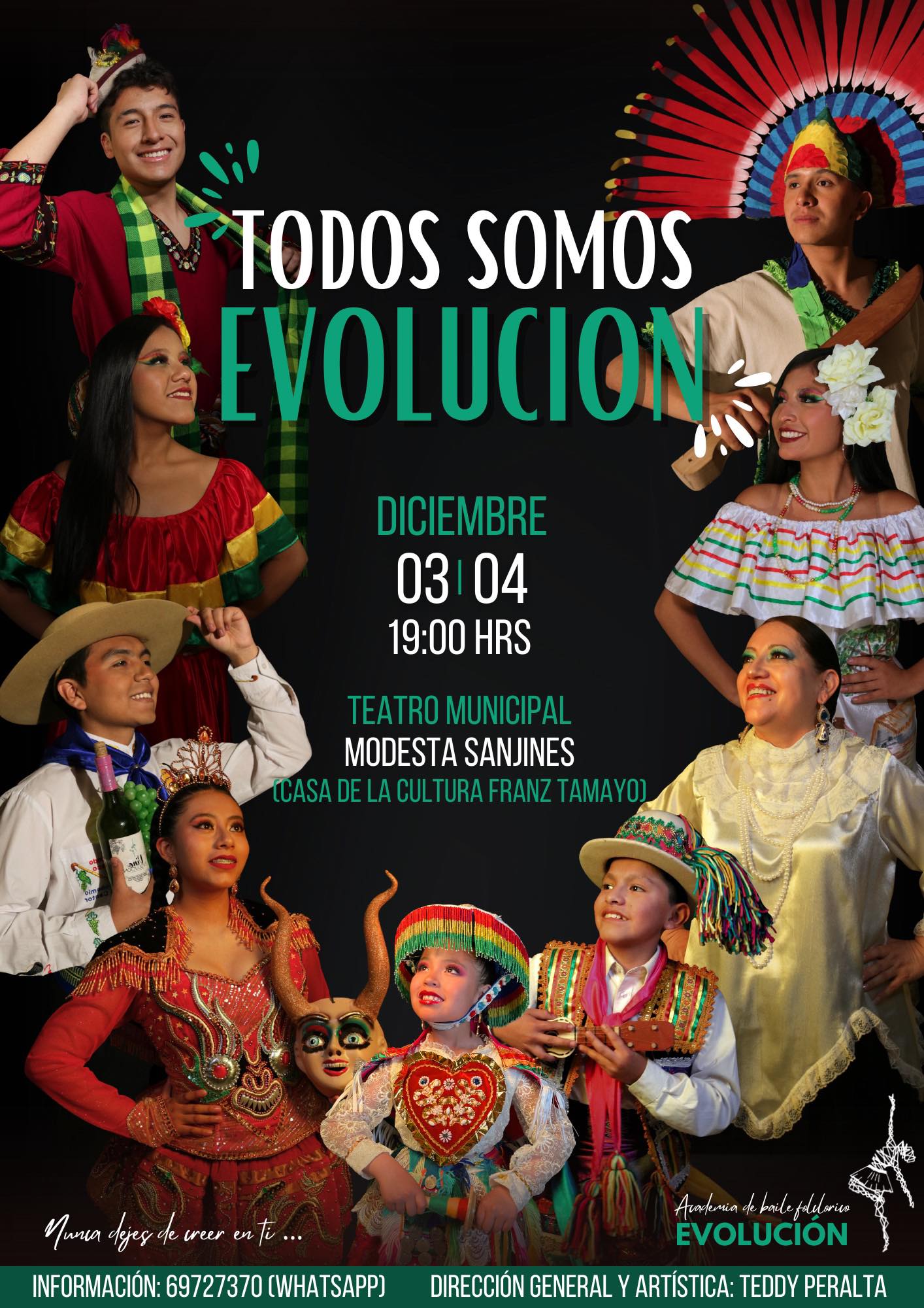 La Academia de Baile Folclórico Evolución presenta su espectáculo anual “Todos somos evolución”, una puesta en escena que reúne a todos sus elencos en un programa dedicado a mostrar el trabajo formativo, técnico y artístico desarrollado durante la gestión 2025. El evento incluye obras de repertorio folclórico y propuestas coreográficas interpretadas por los diferentes niveles de la institución.