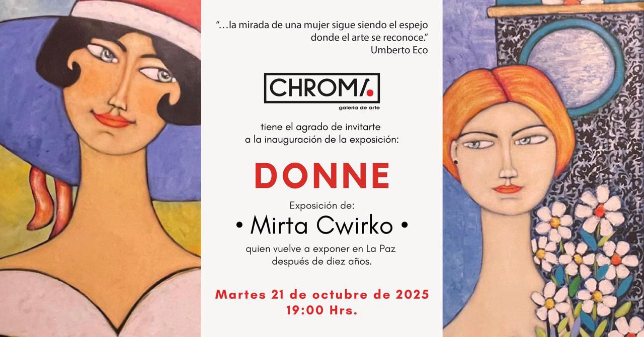 Después de 10 años Mirta Cwirko vuelve a La Paz con una exposición llena de color y sensibilidad. La colorida paleta que envuelve a cada mujer crea la atmósfera perfecta para las cálidas y misteriosas miradas, aquellas que salen del alma junto a una esencia simbólica que cobra vida a través de la mano de la artista.