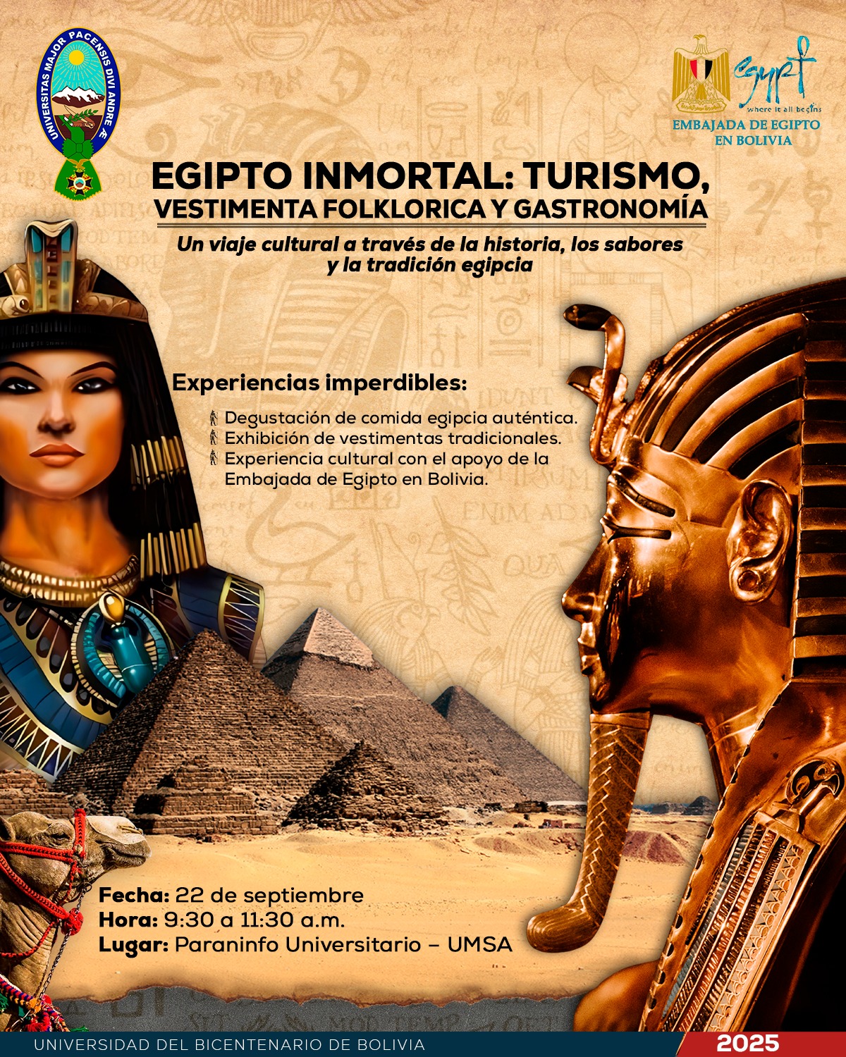 La UMSA y la Embajada de Egipto en Bolivia invitan a toda la comunidad académica y a la población en general a vivir un viaje cultural, descubriendo la historia, los sabores y las tradiciones del antiguo Egipto. Una oportunidad especial para los que deseen conocer o tengan curiosidad por la riqueza cultural de Egipto.