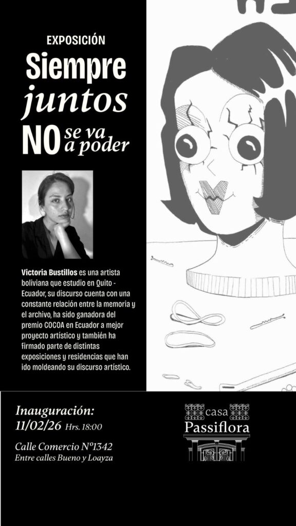 Victoria Bustillos , artista boliviana formada en Quito, Ecuador, expondrá su trabajo y presentará su fanzine en Casa Passiflora. Su práctica explora la relación entre memoria y archivo. Es ganadora del Premio COCOA Ecuador a mejor proyecto artístico y ha participado en diversas exposiciones y residencias.