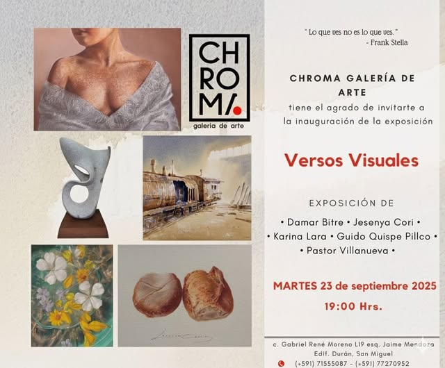 DETALLES DEL EVENTO Versos visuales: exposición Inauguración de una exposición de arte que celebra la conexión entre poesía, escultura y pintura. Damar Bitre Jesenya Cori Karina Lara Guido Quispe Pillco Pastor Villanueva MÁS INFORMACIÓN 71555087 ETIQUETAS escultura, fotografía INFORMACIÓN DEL EVENTO Chroma - Galeria de Arte https://www.facebook.com/chromagaleria https://www.instagram.com/chromagaleria/ COSTO FECHA 23/09/2025 − HORA 19:00 − UBICACIÓN San Miguel, calle Gabriel René Moreno, esq. Jaime Mendoza, Edif. Durán L19 Guarda este evento en tu calendario. GOOGLE CALENDAR MÁS INFORMACIÓN 71555087 ETIQUETAS escultura, fotografía Comparte este evento con tus contactos