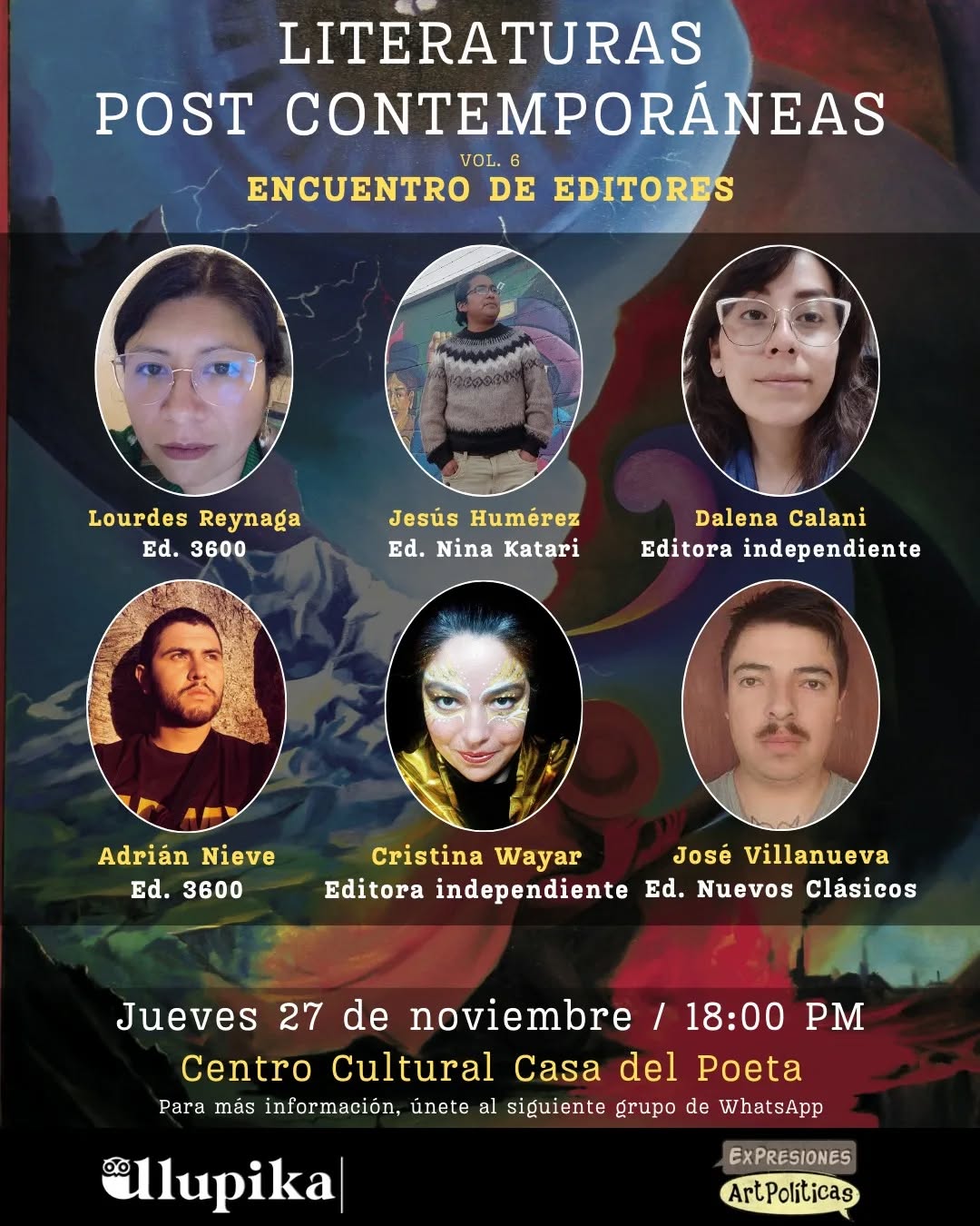 Encuentro dedicado a reflexionar sobre los desafíos, enfoques y procesos de la edición contemporánea en Bolivia. La actividad reúne a editores de distintos proyectos para dialogar sobre nuevas escrituras, propuestas estéticas y la manera en que la edición se vincula con las literaturas actuales.