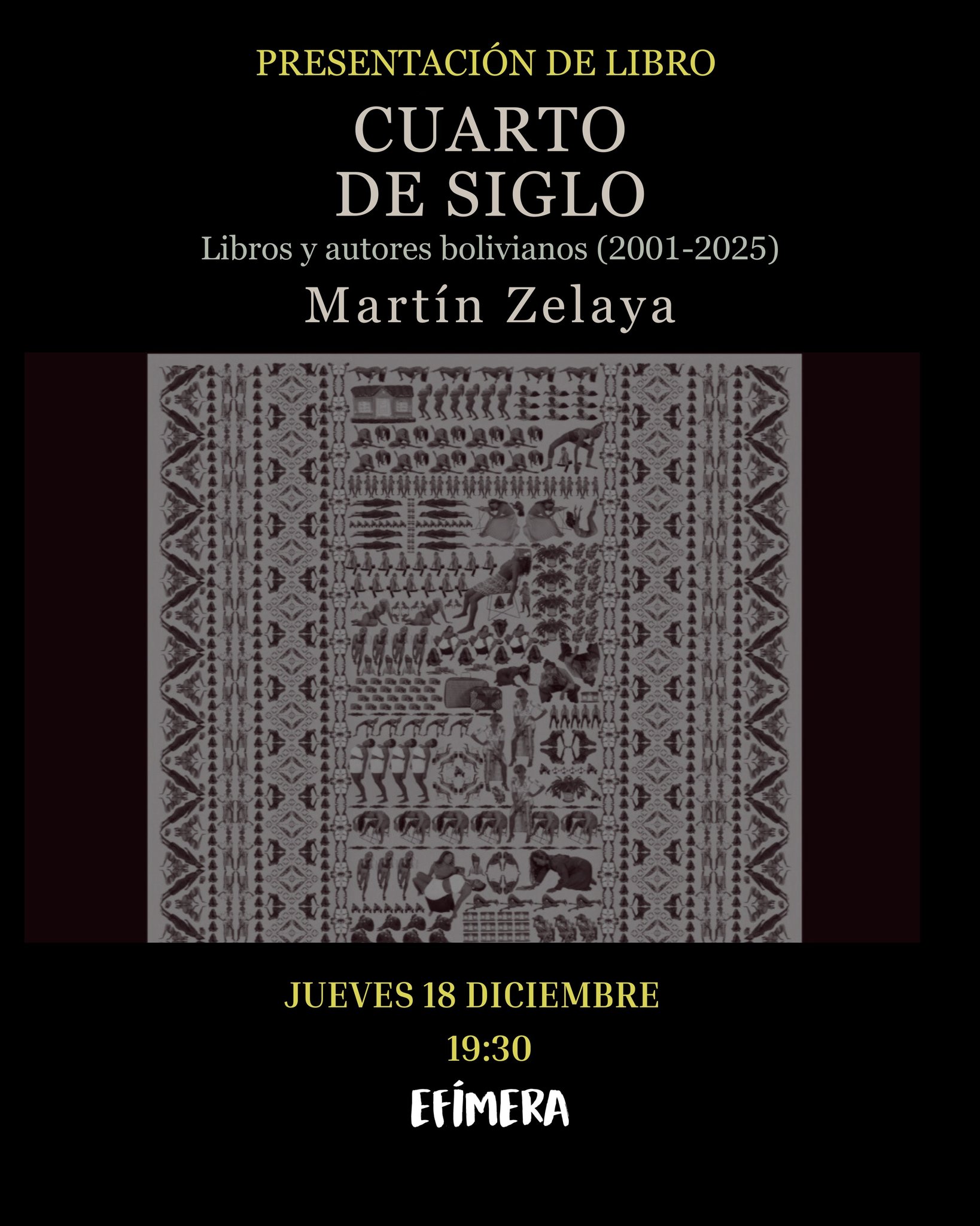 El periodista y crítico Martín Zelaya llega a Efímera para presentar su nuevo libro: Cuarto de siglo. Libros y autores bolivianos (2021 – 2025), producto de su trabajo como editor e investigador en literatura boliviana.