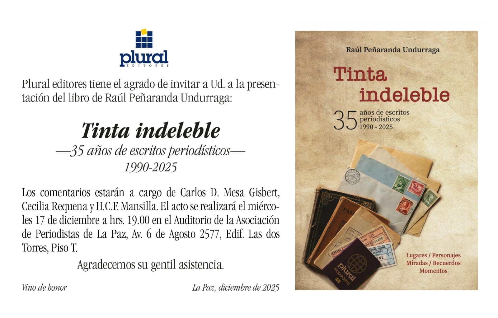 Plural Editores presenta el libro Tinta Indeleble con una recopilación de 35 años de escritos periodísticos (1990–2025), de Raúl Peñaranda Undurraga. Los comentarios estarán a cargo de Carlos D. Mesa Gisbert, Cecilia Requena y H.C.F. Mansilla.