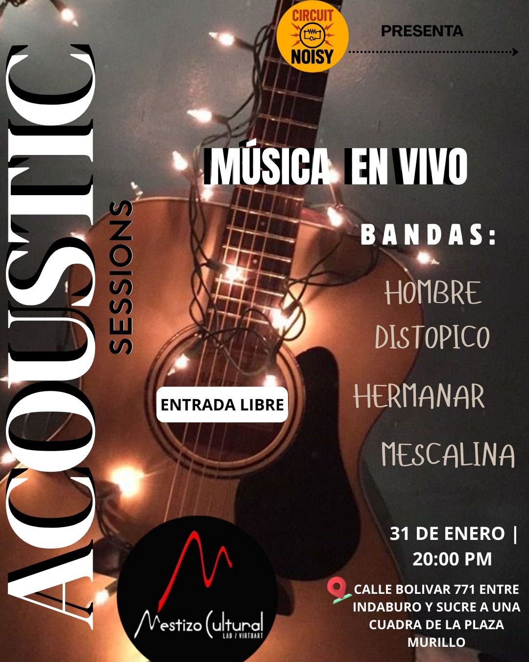 DETALLES DEL EVENTO Acoustic Sessions El colectivo Circuit Noisy presenta a cuatro bandas locales de rock en formato acústico: Hombre Distópico Hermanar Mescalina MÁS INFORMACIÓN 76221110 ETIQUETAS concierto INFORMACIÓN DEL EVENTO Mestizo Cultural https://www.facebook.com/MestizoCultural.virtuart?__cft__[0]=AZZP_Td88el_Do_k6vn69VMf5fhZjTxj43k8BYTO-pr-agQpUMmO884F_R3y8IhwXv0_uSpVPN_IoUoXKJWhK9hCfqUA1oNAFrVCdORdBdP44sy9YhLlu6k0yFaWOTRBDY94G1F-fXdtQFX84RLKw9fiQFIhbaP72z-oHCslhMhZ82puxqijdbdF3yTWqQR89xcTxX15kNUeniOvSz9ehM-5&__tn__=-UC*F COSTO Ingreso libre FECHA 31/01/2026 − HORA 21:30 − UBICACIÓN Calle Bolívar entre Indaburo y Sucre Guarda este evento en tu calendario. GOOGLE CALENDAR MÁS INFORMACIÓN 76221110 ETIQUETAS concierto Comparte este evento con tus contactos