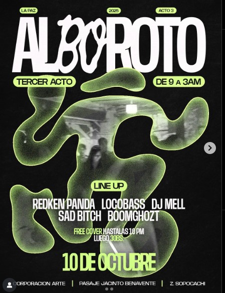 Llega el caos a la ciudad de La Paz para hacer vibrar la noche con una nueva experiencia alternativa. Un oasis de música club que invita a explorar y descubrir haciendo alboroto. Los invitados al evento son Redken Panda, Locobass, Djmell y Sadbitch.