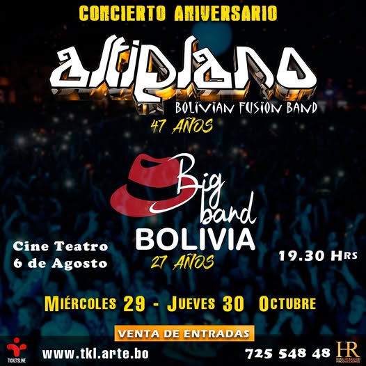 En el marco del Bicentenario de Bolivia, dos de las agrupaciones más emblemáticas del país se unen en un concierto histórico que celebra la fuerza del jazz y la esencia de la música andina. El grupo Altiplano Bolivian Fusión Band, con 47 años de trayectoria y un legado inconfundible en la fusión de ritmos tradicionales, compartirá escenario con la Big Band Bolivia, que celebra 27 años de mantener vivo el espíritu del jazz contemporáneo. El espectáculo “De los Andes al Mundo” promete una experiencia sonora única, donde los vientos del altiplano se entrelazan con la libertad del jazz, proyectando la identidad musical boliviana hacia el mundo.