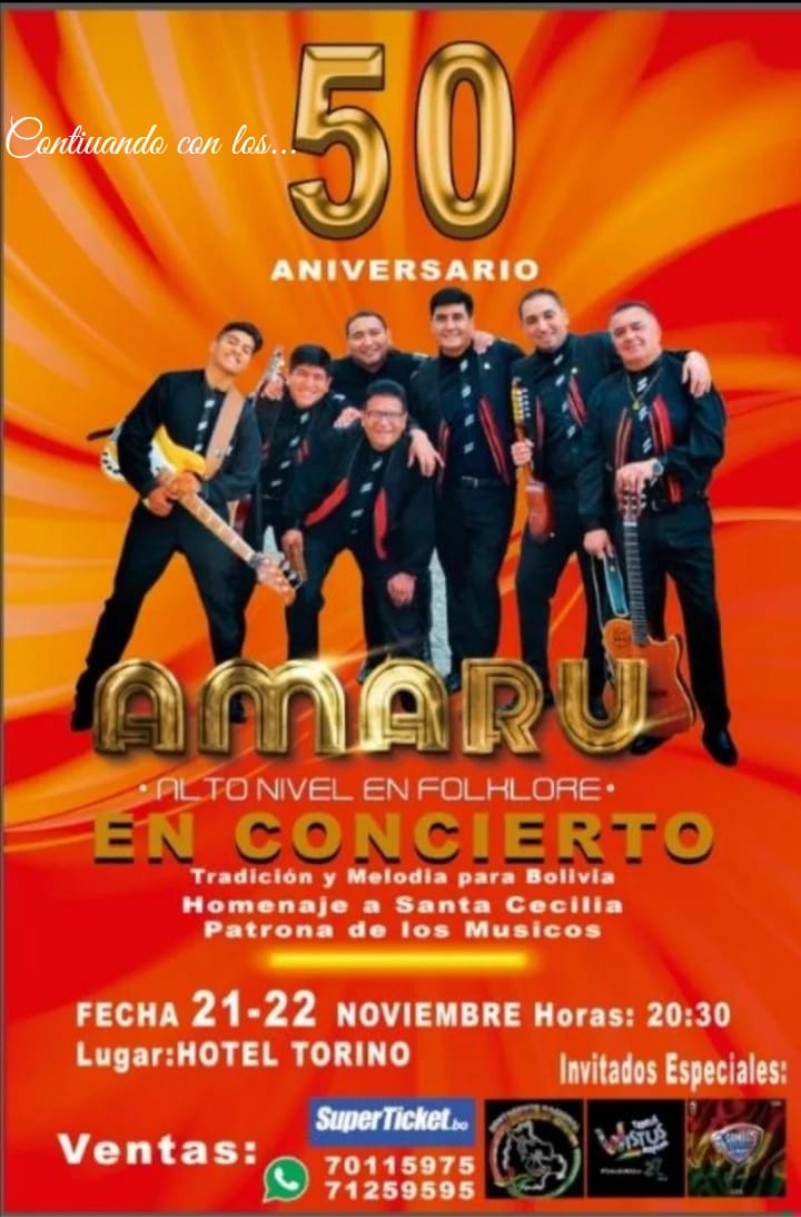 Amaru presenta un concierto especial por sus 50 años de trayectoria, en homenaje a Santa Cecilia, patrona de los músicos. La agrupación contará con la participación de Sentimiento Nacional, Sambos Caporales y Tinkus Wistus, en una propuesta que celebra medio siglo de música y tradición.