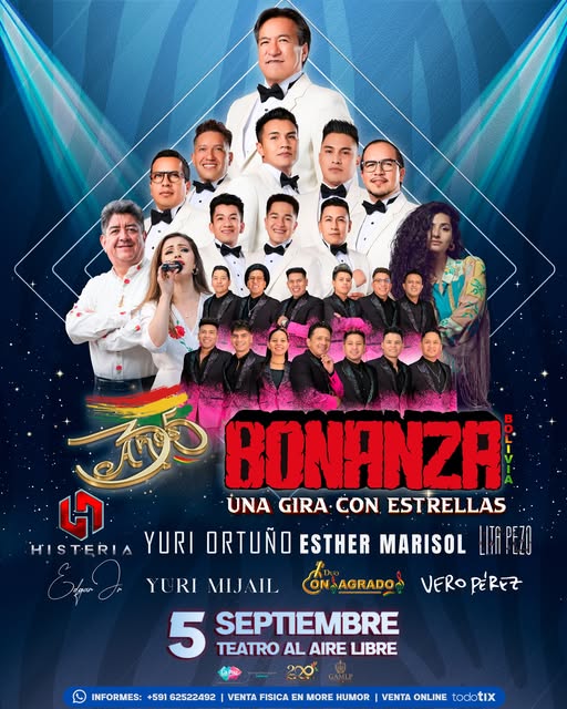 Bonanza conmemora sus 35 años de trayectoria musical con un espectáculo especial junto a reconocidas figuras de la música nacional. El evento reúne en un mismo escenario a artistas como Histeria, Yuri Ortuño, Esther Marisol, Vero Pérez, Lita Pezo, Yuri Mijail, Edgar Junior y el Dúo Consagrado.