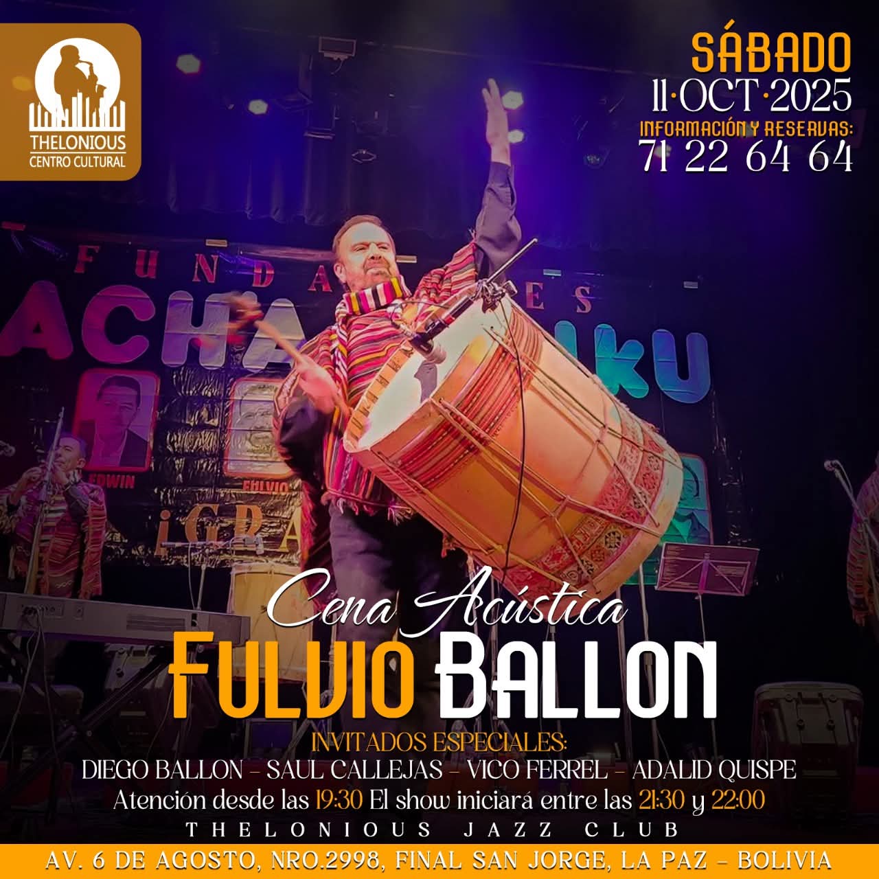 Una velada dedicada a la trayectoria de un importante artista de la música boliviana. Fundador de la icónica agrupación Jacha Mallku e integrante de conjuntos como Akamau, Charangos de Bolivia y Antawara, es autor de composiciones emblemáticas como “Linda La Paz”, “Quisiera quererte más”, “Vives en mí” y “Encontré el amor”. Una noche íntima, con la participación especial de Diego Ballón, Saúl Callejas, Vico Ferrel y Adalid Quispe. El ingreso incluye la cena con lasaña como plato principal.