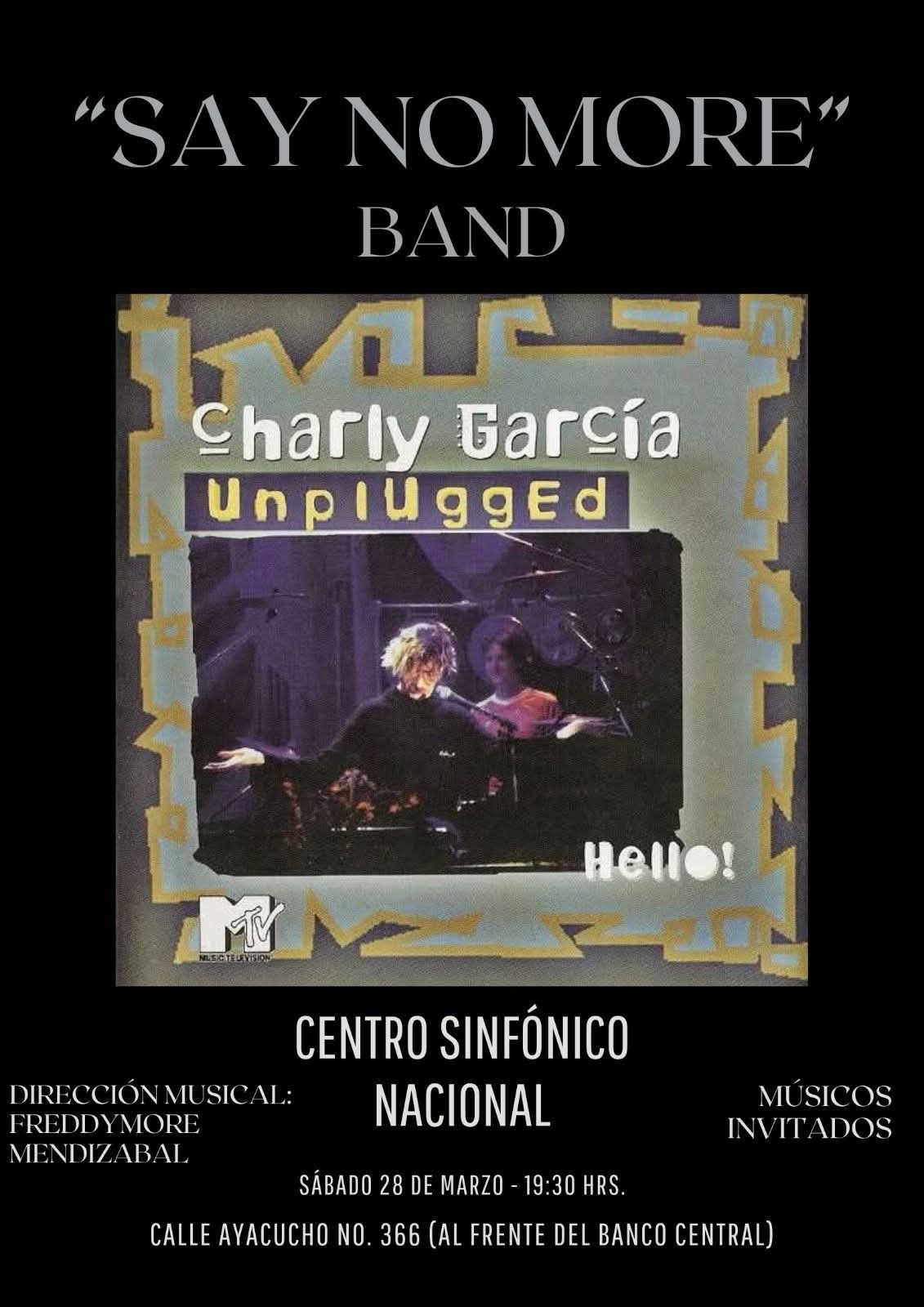 Una noche única para revivir uno de los conciertos más icónicos del rock latino. La Say No More Band presenta un homenaje especial al legendario MTV Unplugged de Charly García, interpretando el disco en su integridad, junto con canciones inolvidables del maestro.