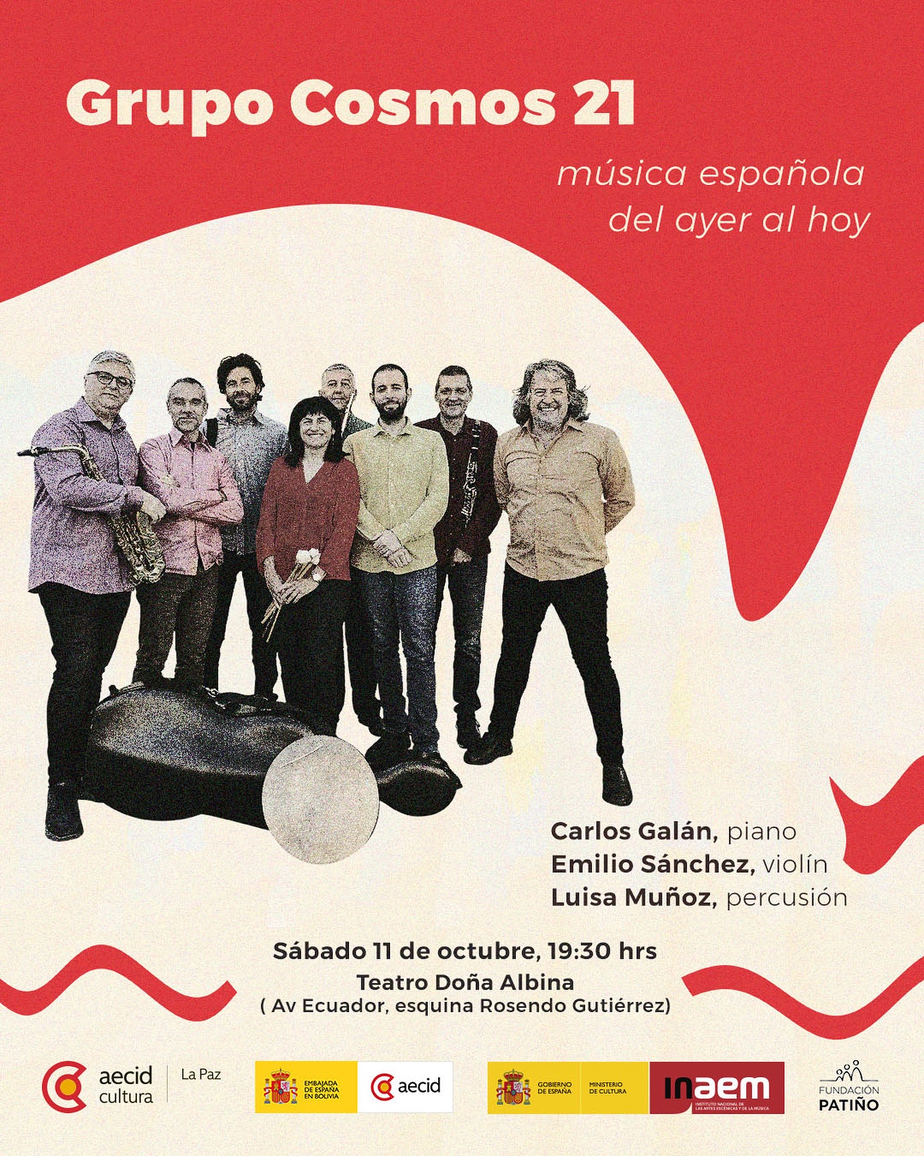 Concierto del grupo Cosmos 21, uno de los referentes de la música contemporánea española. Bajo el título “Música española del ayer al hoy”, el grupo ofrecerá un recorrido sonoro que conecta tradición y vanguardia, celebrando los lazos culturales entre España y Bolivia.