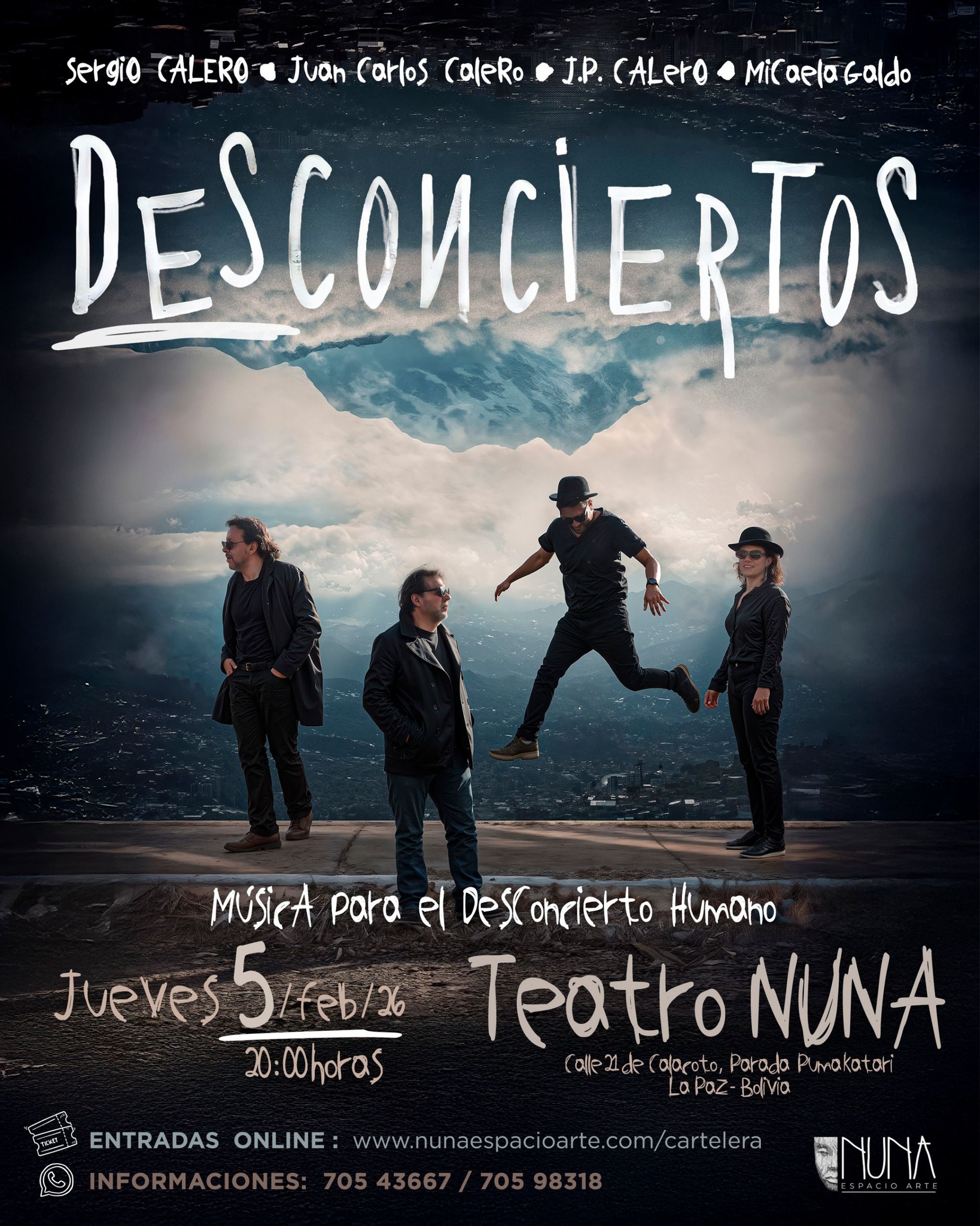 Por primera vez el escenario Nuna recibe la inclasificable propuesta de Desconciertos, un cuarteto que no se pone límites. Dos arquitectos, una fonoaudióloga y un comunicador social dejan sus oficios cotidianos para colgarse los instrumentos con los cuales irrumpir en un escenario obligado para sus vidas, el de la música. Seducidos por el rock, como por otras formas musicales, han decidido llevar adelante no unos conciertos, sino más bien una serie de DesConciertos, al grado que así han bautizado el proyecto, por lo que sólo queda ser testigos de su irrupción musical, su diverso repertorio, su inusual propuesta para dejarse… desconcertar.