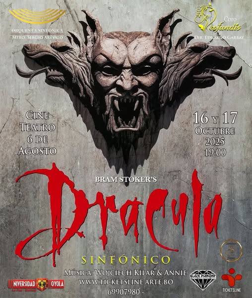 La orquesta Loyola Sinfónico Coral y el coro De Profundis presentan Drácula de Bram Stoker Sinfónico, un concierto excepcional en el que más de 120 músicos y cantantes interpretarán en vivo la banda sonora de la aclamada película de Francis Ford Coppola, compuesta por Wojciech Kilar y Annie Lennox. Durante la función, se proyectarán imágenes de la película acompañadas por la interpretación orquestal sincronizada, creando una experiencia inmersiva que combina cine y música. El espectáculo estará bajo la batuta del Maestro Sergio Arévalo y la dirección artística de Omar Eduardo Garbay.