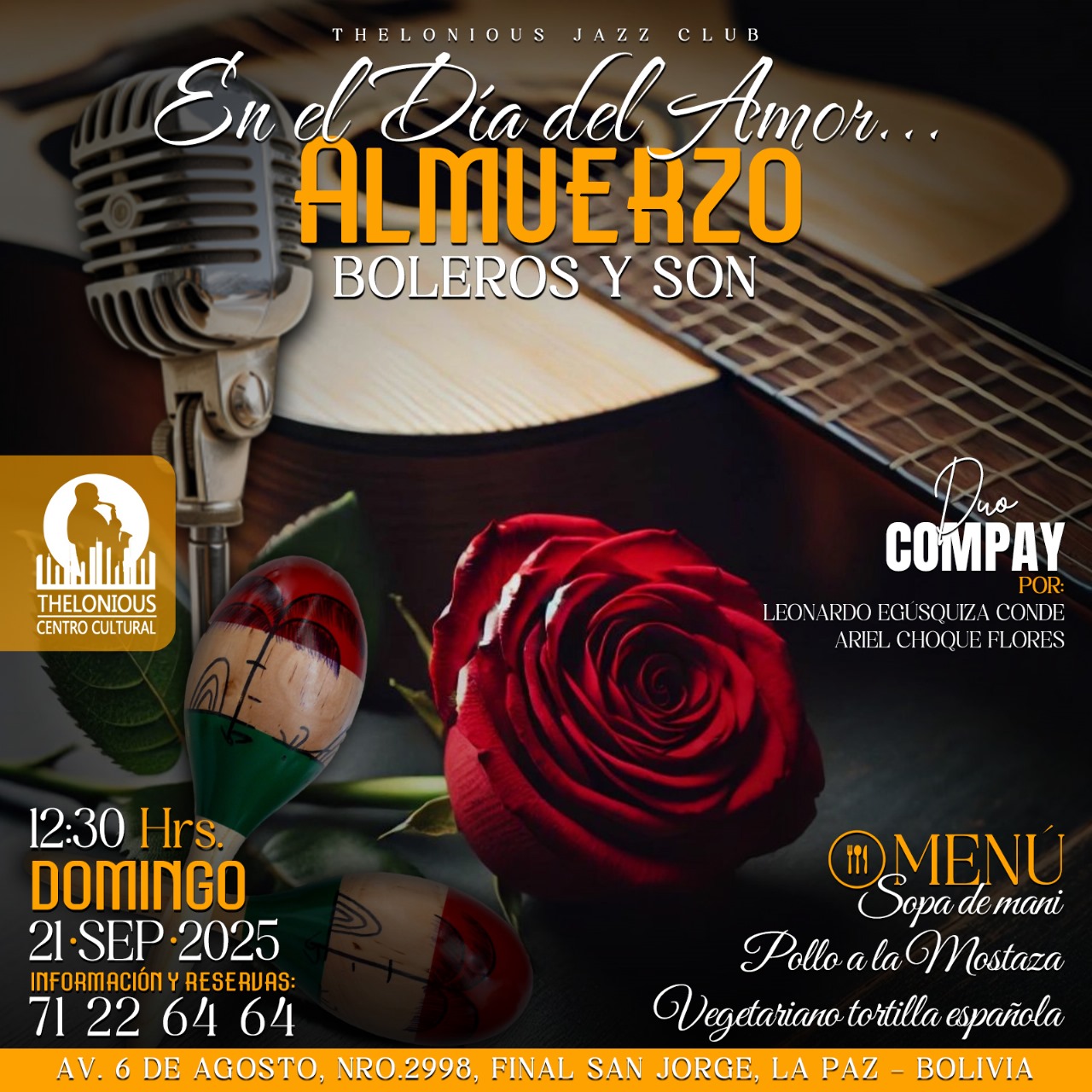 El Dúo Compay, integrado por Leonardo Egúsquiza Conde y Ariel Choque Flores, ofrecerá un repertorio de boleros y son en un almuerzo romántico acompañado de un menú especial.