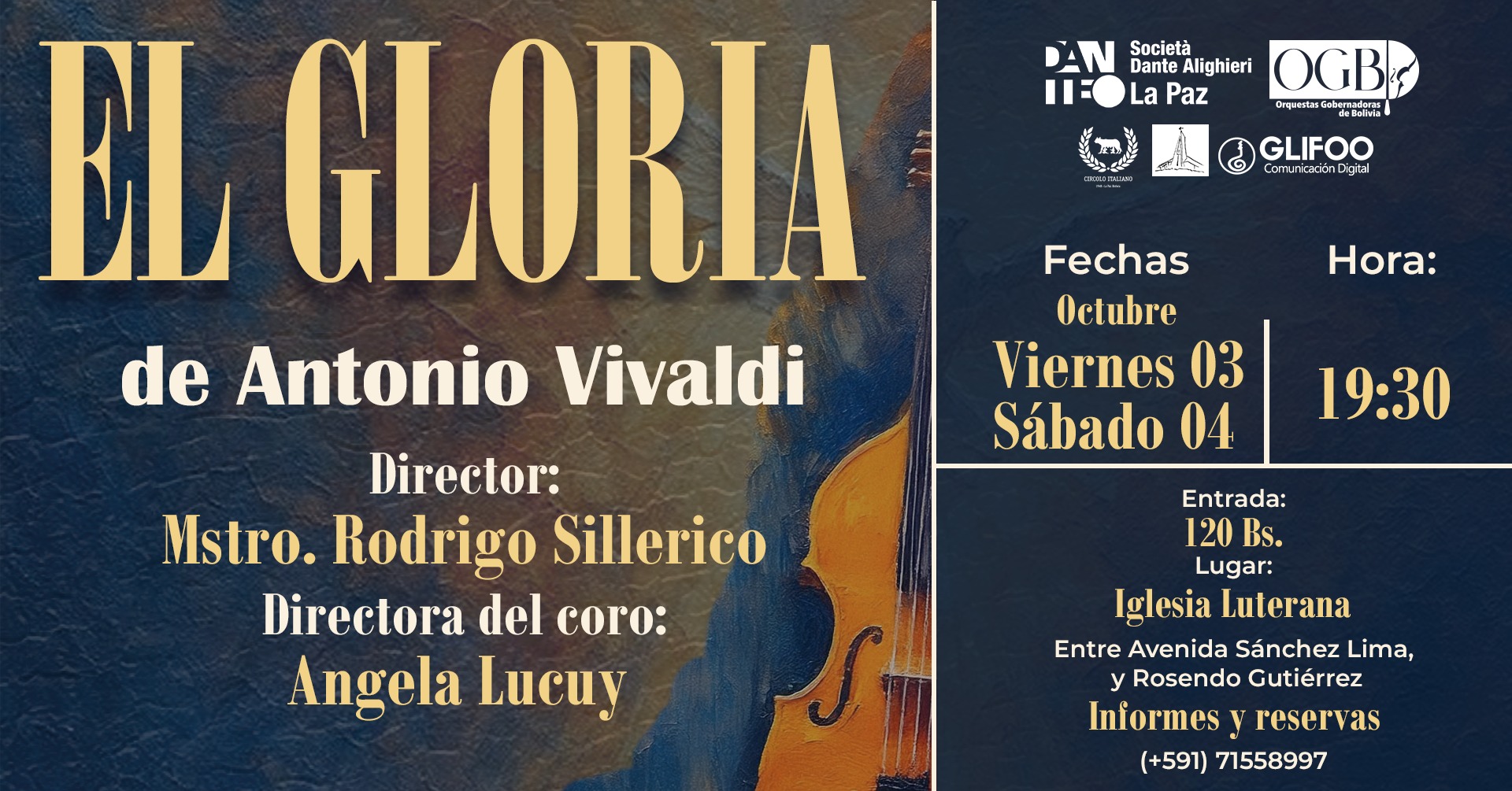 El Gloria de Antonio Vivaldi, una de las obras maestras más emblemáticas del barroco, será interpretado por las Orquestas Gobernadores de Bolivia, la Sociedad Dante Alighieri y el Coro de La Dante Alighieri, bajo la dirección del maestro Rodrigo Sillerico. Un encuentro de música sacra y virtuosismo instrumental en la Iglesia Luterana de Sopocachi.