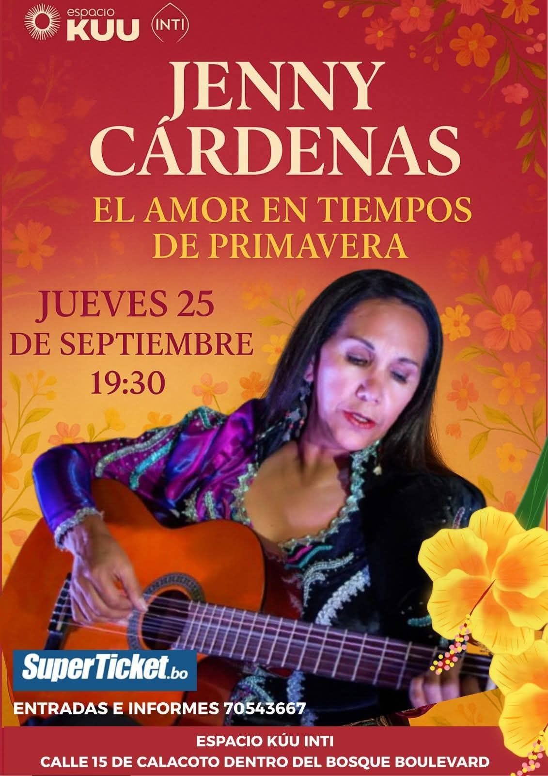 El Espacio Kúu Inti será escenario de este concierto de Jenny Cárdenas, cantautora boliviana que presentará un repertorio dedicado a la poesía, la música y el sentimiento. La propuesta busca reflejar cómo la primavera no solo se manifiesta en la naturaleza, sino también en las canciones que transmiten emoción y memoria colectiva.