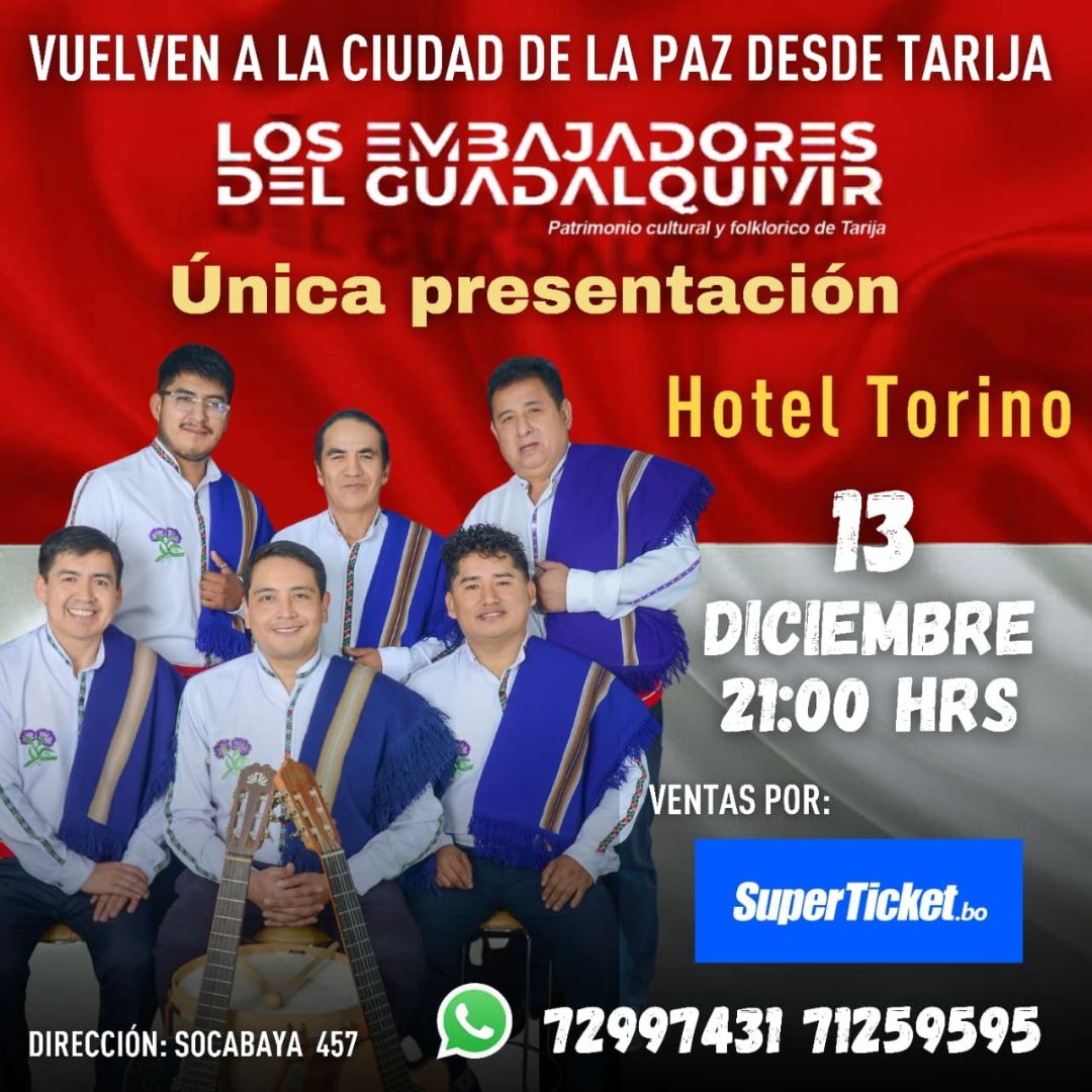El Centro Cultural Torino recibe a Los Embajadores del Guadalquivir en un concierto íntimo que reúne cuecas, bailecitos y la tradición musical tarijeña. La presentación propone un encuentro cercano con el repertorio característico del grupo, reconocido por su estilo bohemio y su aporte al folclore del sur del país.