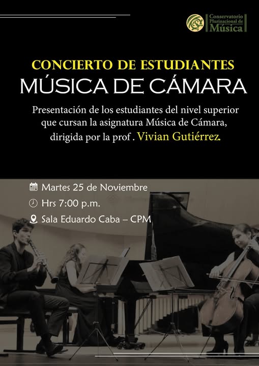 Este martes 25 de noviembre se llevará a cabo el concierto de los estudiantes del nivel superior que cursan la materia de música de cámara con la profesora Vivian Gutiérrez del Conservatorio Plurinacional de Música.