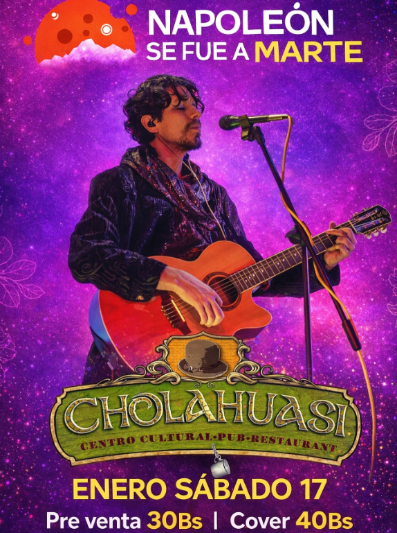 La banda de folk fusión originaria de Cochabamba que mezcla ritmos tradicionales bolivianos (como la tonada, cueca y morenada) con rock, funk y cumbia, Napoleón se fue a Marte, actuará este sábado en Cholahuasi.