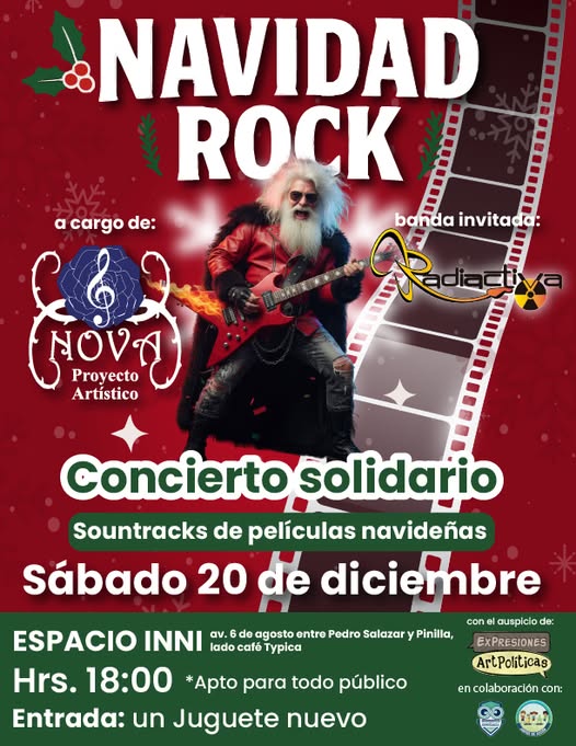 Presentación de Nova, con un programa centrado en versiones de rock de bandas sonoras de películas clásicas, junto a la participación de la banda invitada Radiactiva. La actividad contempla como modalidad de ingreso la entrega de un juguete nuevo por persona, que será destinado a niñas y niños de comunidades rurales a través del trabajo de los voluntarios de Juntos en Acción y Guerreros de Esperanza. El público permanecerá de pie durante toda la presentación.